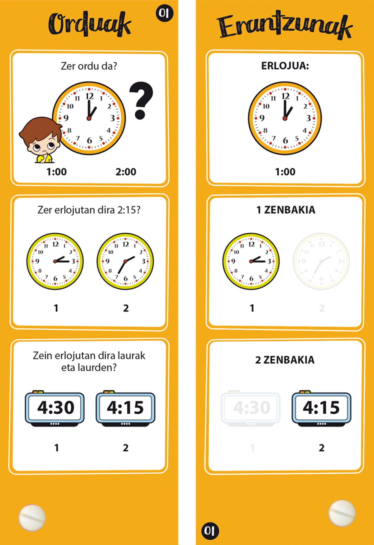 100 galde-erantzun ilustratutik gora, haurrek orduak, batuketak eta kenketak, denbora eta beste gauza asko ikas ditzaten jolastu eta dibertitu bitartean.