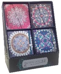 Estos libros de notas constituyen una auténtica joya, por su exquisito diseño y la calidad de su encuadernación en cartoné con relieve sobre laminado de plata. Están cosidos y su interior es liso. Disponen de marcapáginas estampados. Dos modelos tienen cierre con solapa magnética y otros dos con elástico de terciopelo y ornamento de plata envejecida. El estuche contiene 16 cuadernos y 4 ejemplares de cada uno.