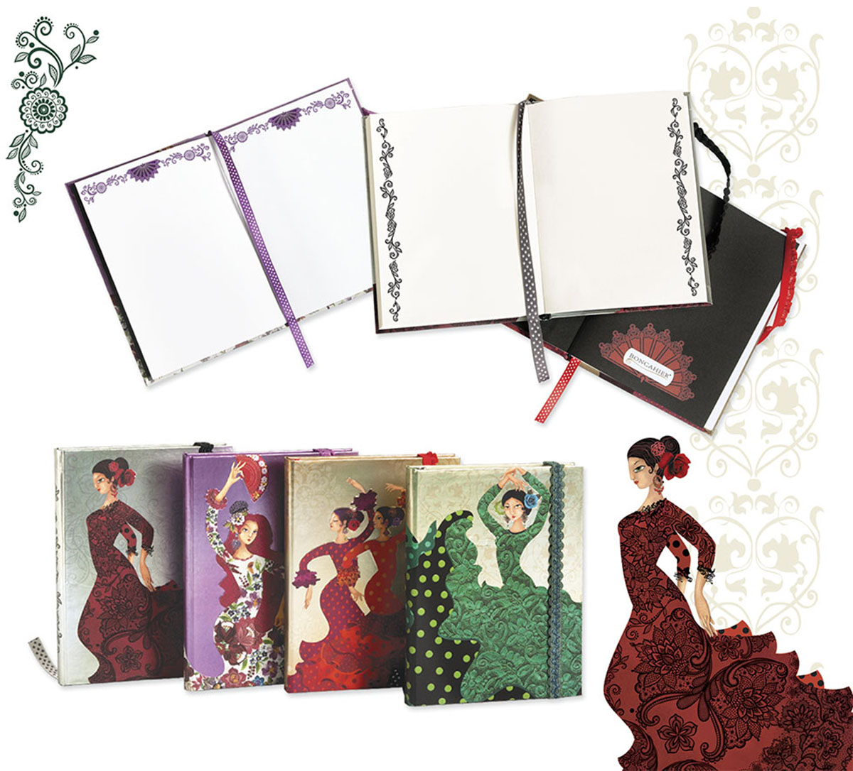 Encuadernación:  Cartoné con relieve sobre laminado plata, cierre con elástico de encaje y marcapág.de raso estampado