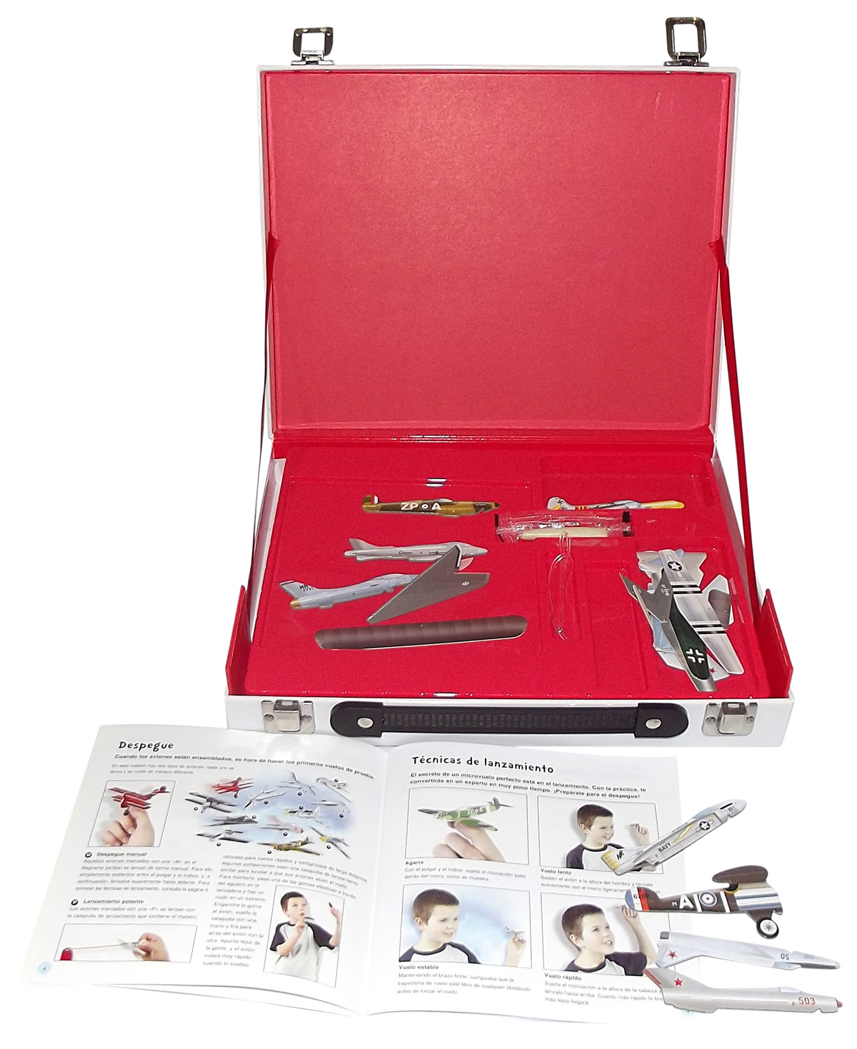 Conviértete en un experto en aviones con este práctico maletín. Contiene un libro con maquetas y láminas de papel para montarlos y hacerlos volar. ¿Estás listo para el despegue?