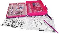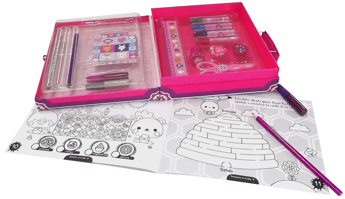 Encuadernación:  Caja de cartón plastif.con cierre y asa, cont:gomas de borrar,pegat.,rotul.,purpurina,pinturas,regla