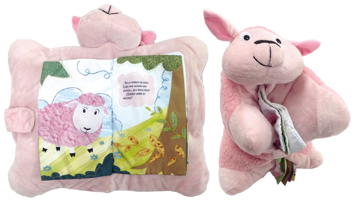 Encuadernación:  Tela acolchda con cierre de velcro, cuento que se transforma en una ovejita de peluche