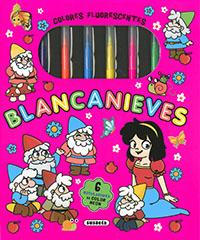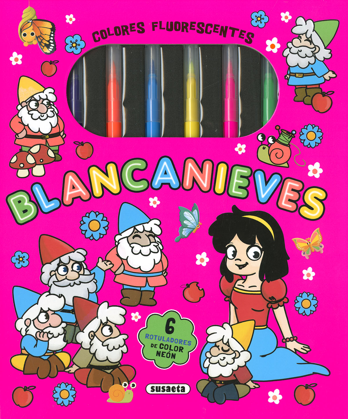 Utiliza las pinturas fluorescentes que encontrarás en este libro y llena de color las mágicas ilustraciones del cuento de Blancanieves y los siete enanitos.