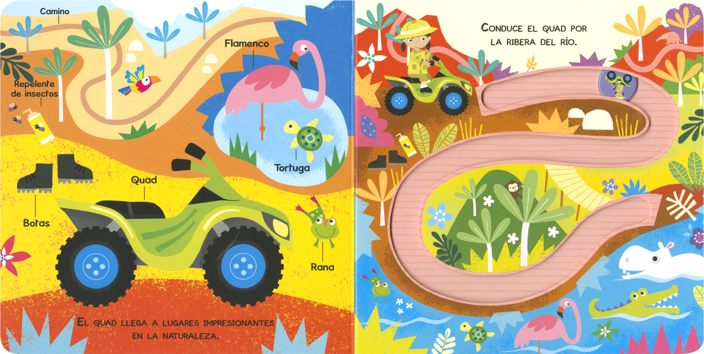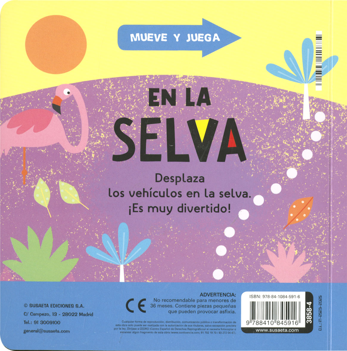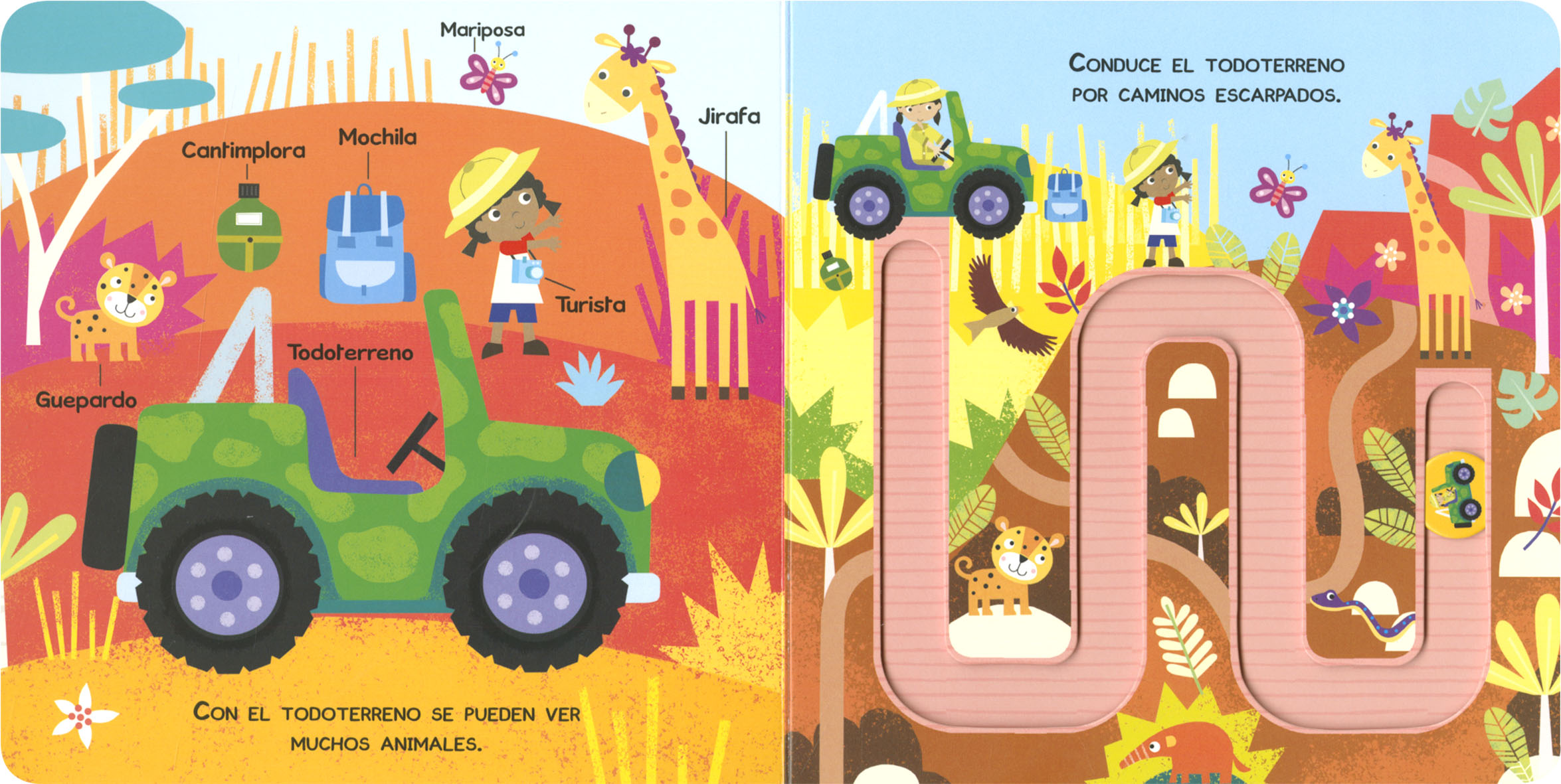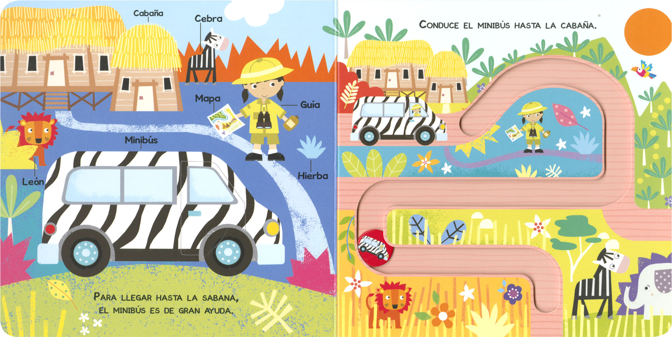 Muévete por la selva y conduce los vehículos hasta el lugar al que quieren ir, siguiendo con su ficha el camino trazado en cada escena. Un libro de cartón interactivo para crecer aprendiendo a través del juego.