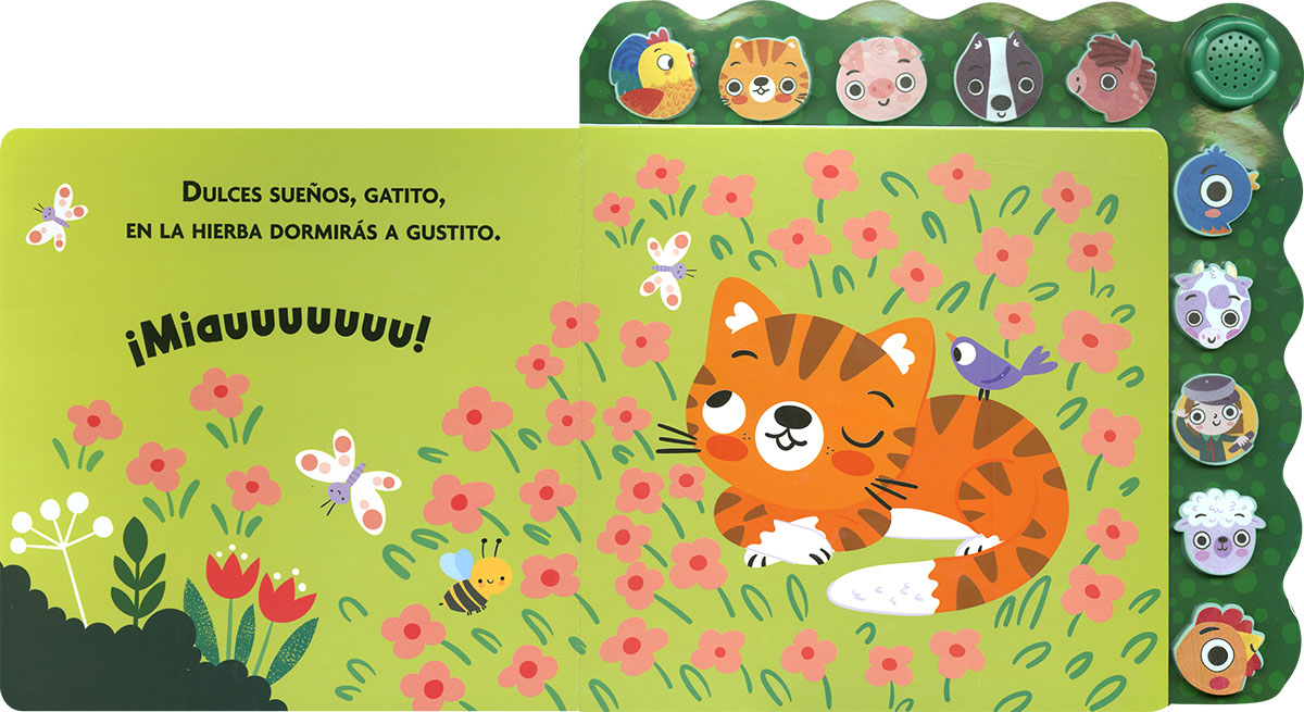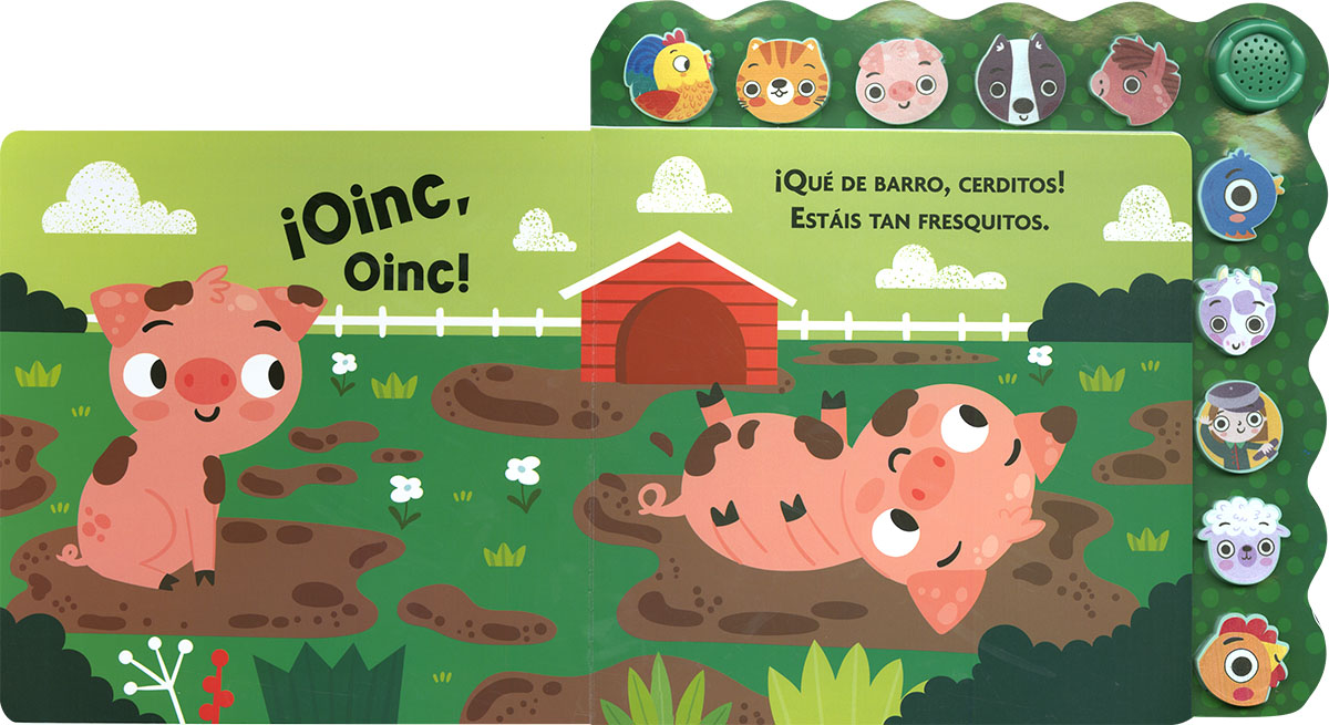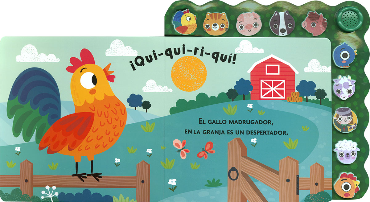 Bienvenido a la granja! Pasa y disfruta de una divertida experiencia sonora con este libro de cartón. Podrás escuchar al gallo, a la vaca, al caballo, al cerdito... Solo tienes que presionar las cabezas de los animales, blanditas y de silicona, para oírlos a todos. Un precioso libro de rimas y sonidos.