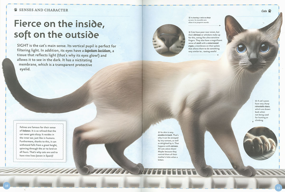 A book with stunning illustrations to discover the most fascinating cats. Do you really think that all cats are the same? The dozens of cat breeds that have emerged all over the world have so many differences between them that no two are alike. Many are of natural origin, but others are the result of selection that for more than a century has made this extraordinary creature the pet with the most personality. This book will reveal the characteristics shared by all cats, at the same time as the peculiarities that set each breed apart. From ancient Egypt to the court of Queen Victoria, accompany the cat on its amazing journey through history and let yourself be captivated by its mesmerizing gaze!