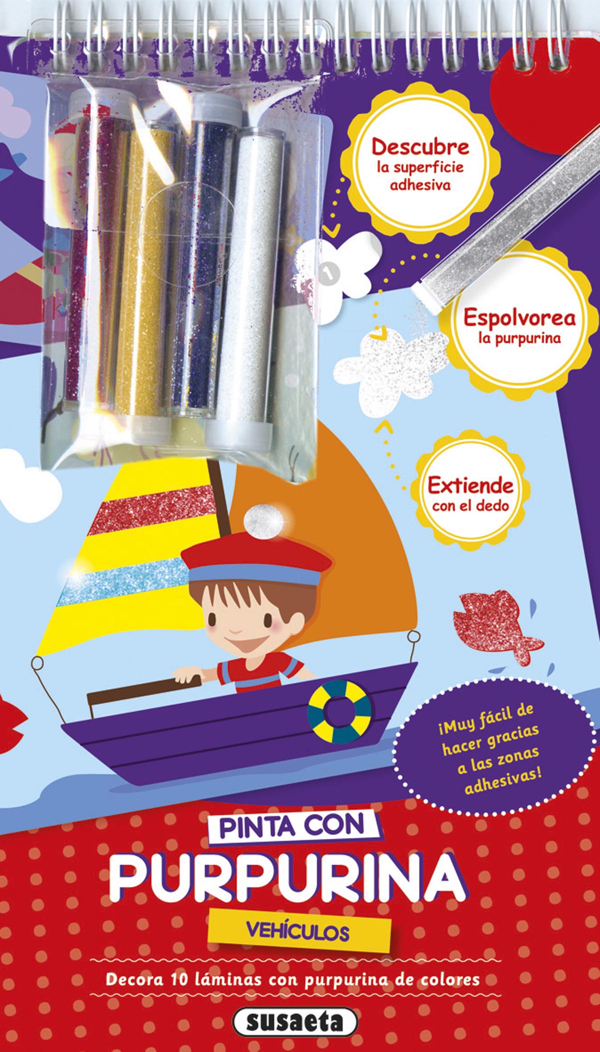 Encuadernación:  Cartulina plastificada con espiral y 4 botes de purpurina de colores