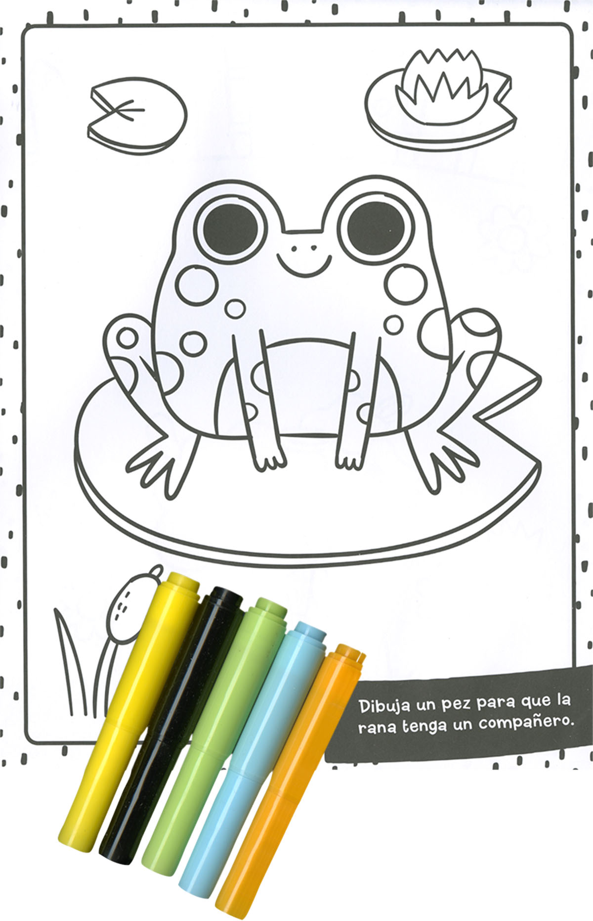 Encuadernación:  Cartoné plastificado brillo y troquelado, incluye libro, 5 rotuladores y pegatinas