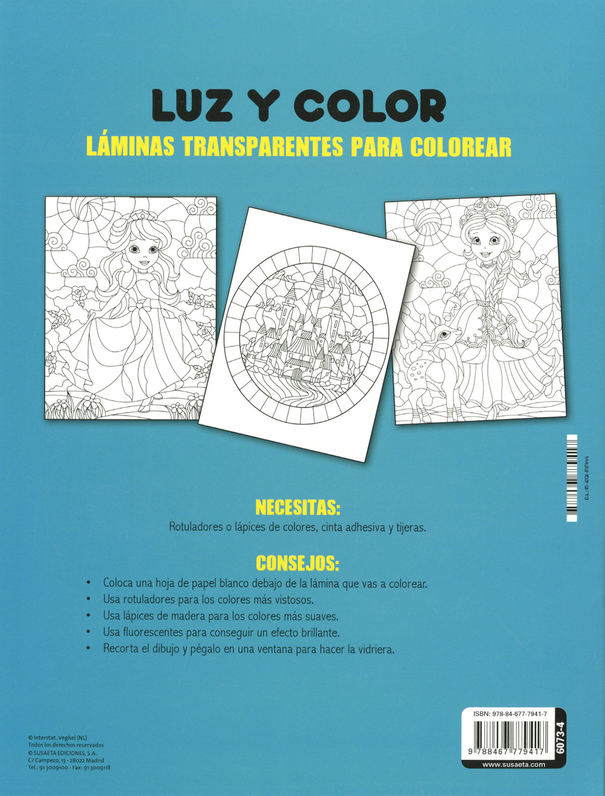 Decora tus ventanas con luminosas ilustraciones coloreando estas láminas de papel transparente que dejan pasar la luz. Sus dibujos de princesas, compuestos de diferentes piezas para poder darles distintos tonos e intensidades, brillarán en el cristal como si fuera una original vidriera. Un libro que a los niños les encantará colorear.