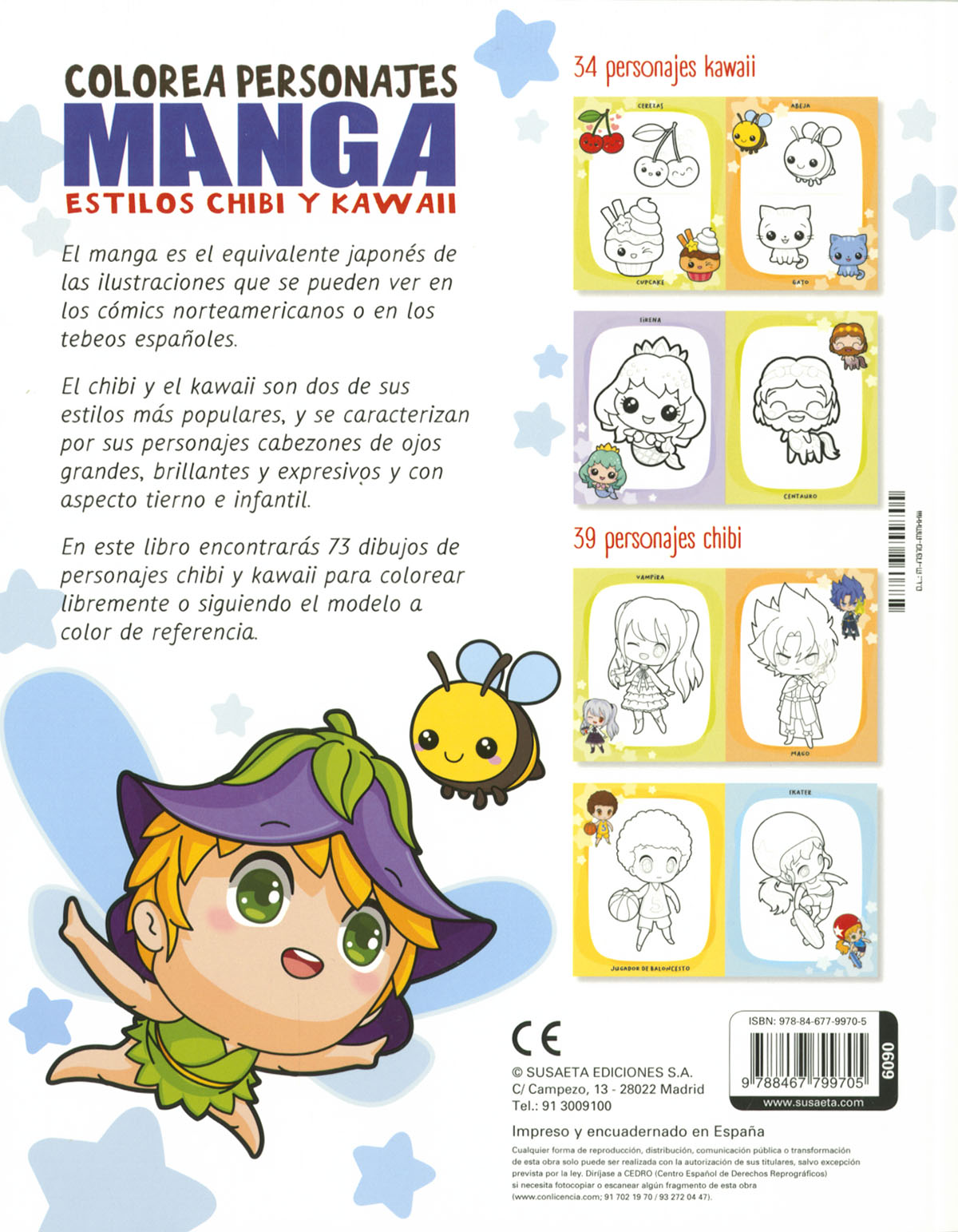 El manga es el equivalente japonés de las ilustraciones que se pueden ver en los cómics norteamericanos o en los tebeos españoles. El chibi y el kawaii son dos de sus estilos más populares, y se caracterizan por sus personajes cabezones de ojos grandes, brillantes y expresivos, y con aspecto tierno e infantil. En este libro, encontrarás 73 dibujos de personajes chibi y kawaii para colorear libremente o siguiendo el modelo a color de referencia.