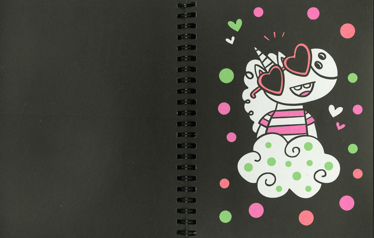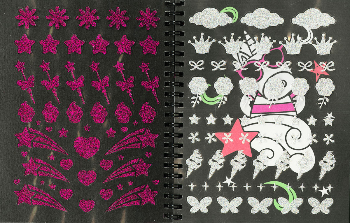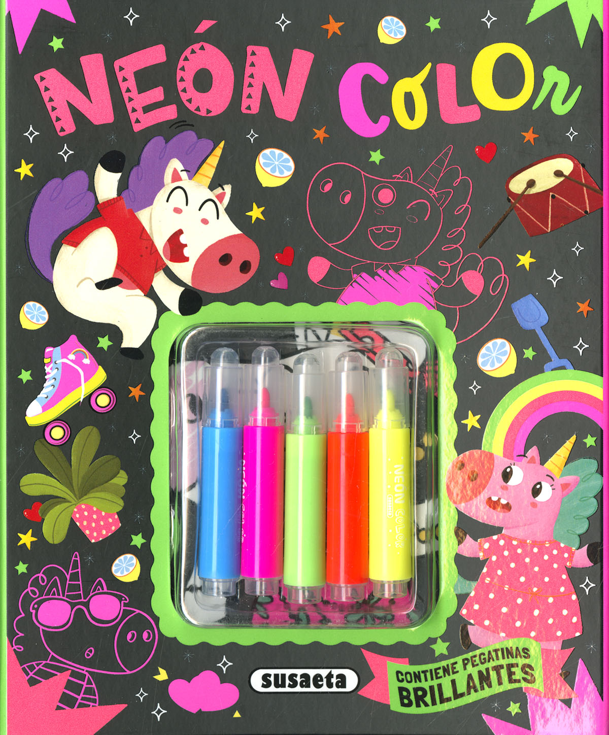 Colorea a estos simp谩ticos y juguetones unicornios con los rotuladores de ne贸n y coloca las pegatinas brillantes donde m谩s te guste. 隆Llena de vida las l谩minas del libro y haz que los dibujos brillen de forma m谩gica!
