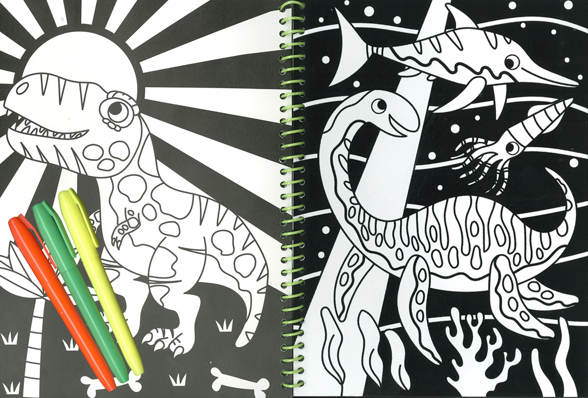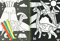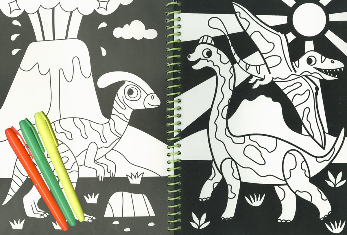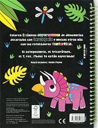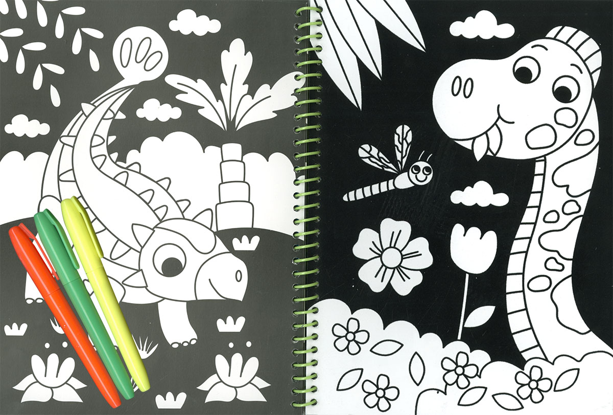 Colorea con los rotuladores fosforitos las láminas de dinosaurios de este libro, entre las cuales encontrarás 8 láminas supersuaves decoradas con terciopelo.