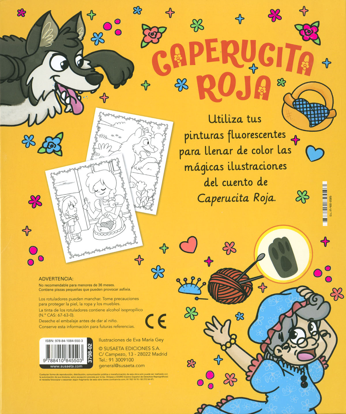 Utiliza las pinturas fluorescentes que encontrarás en este libro y llena de color las mágicas ilustraciones del cuento de Caperucita Roja.