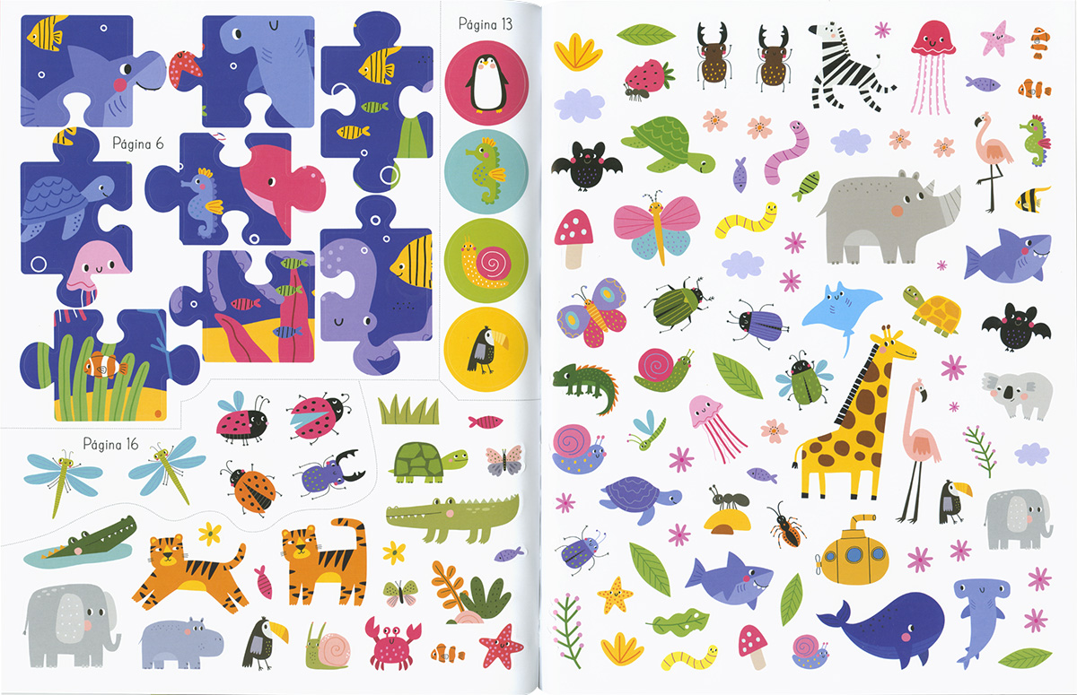 Conoce a un montón de animales divertidos con este libro de actividades. ¡Une los puntos, busca diferencias, dibuja, colorea, recorre laberintos y diviértete con las pegatinas!