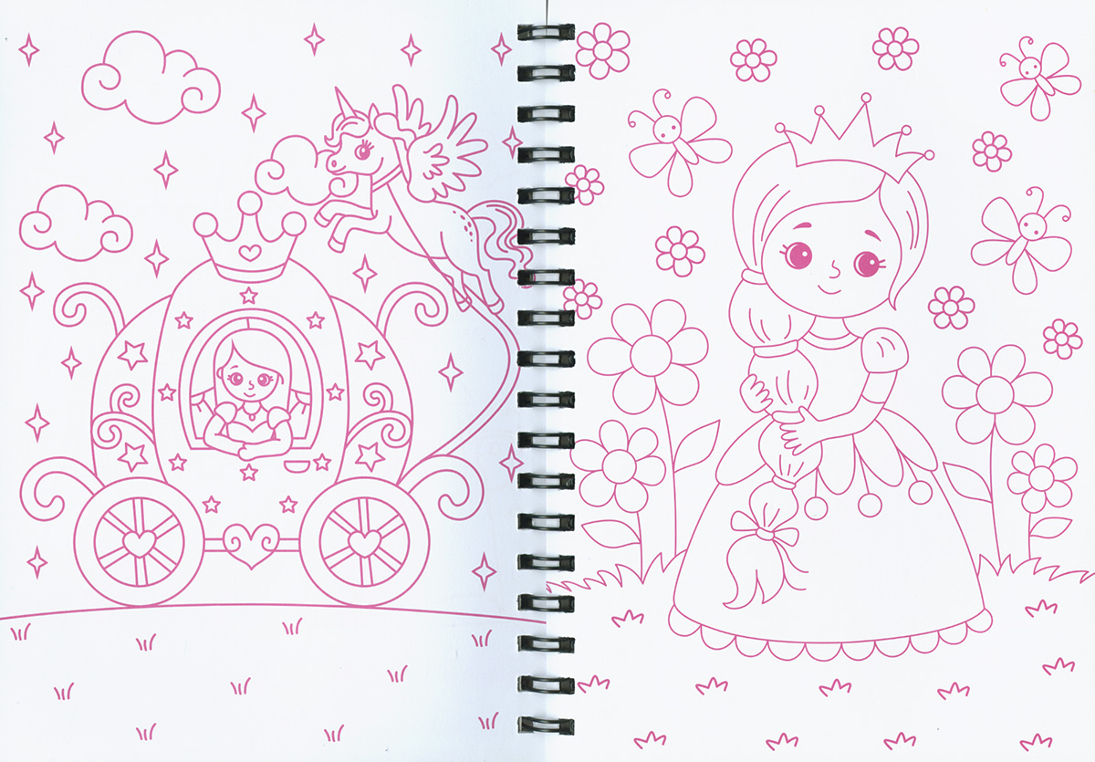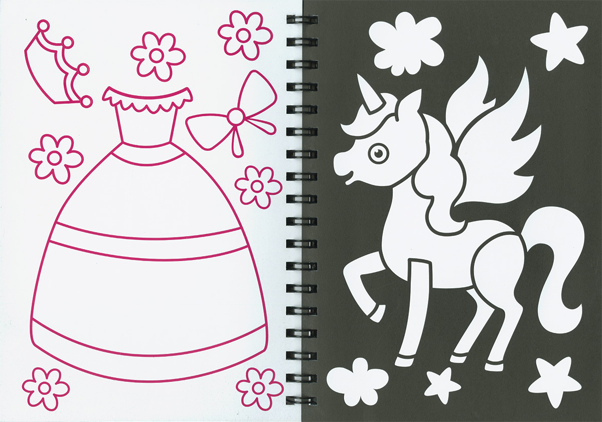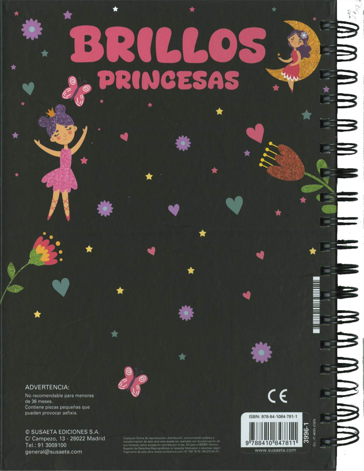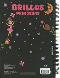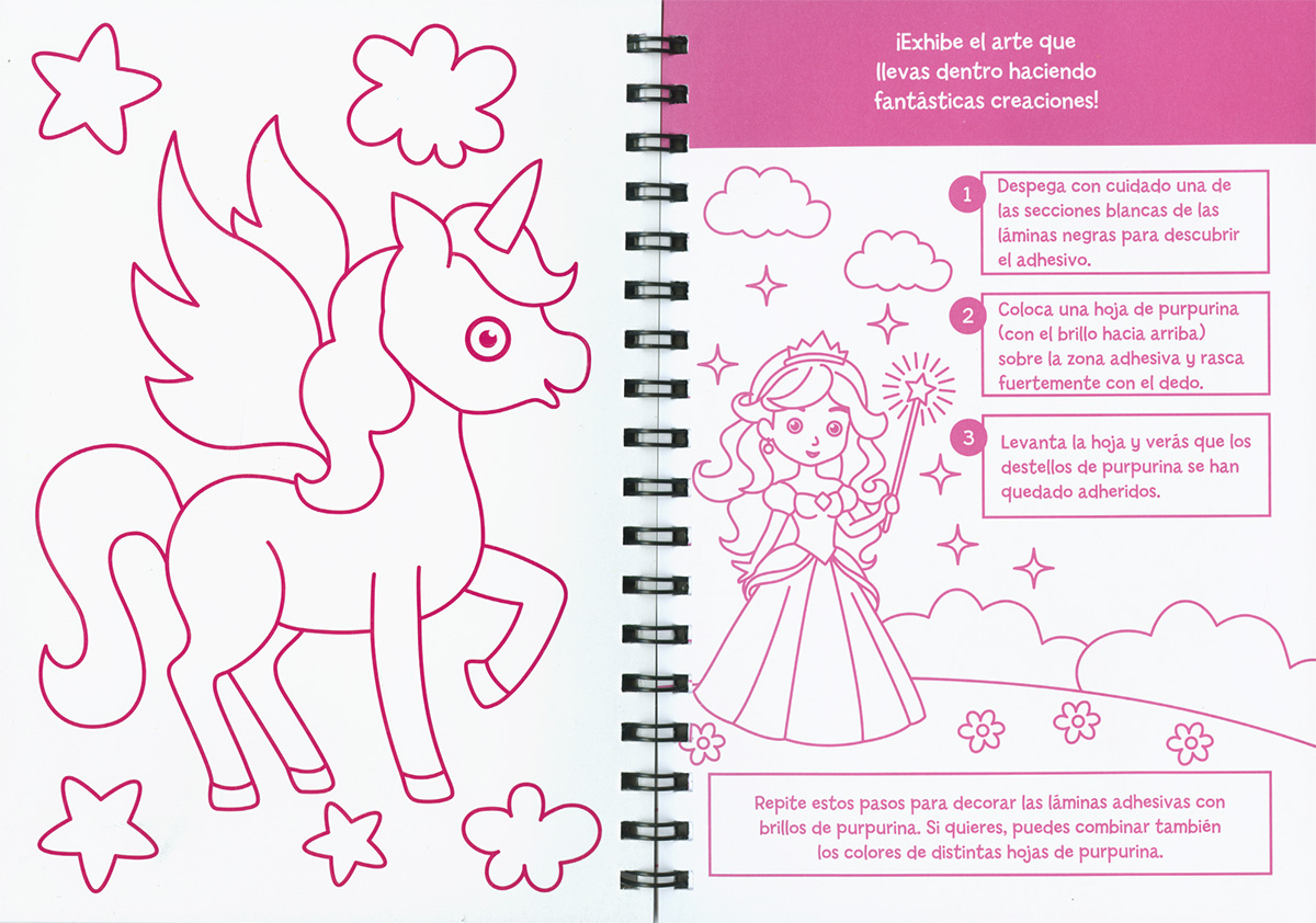 Encuadernación:  Wire-o y cartón con acabado en mate y estampación, troquelado. Con hojas de purpurina y adhesivos.