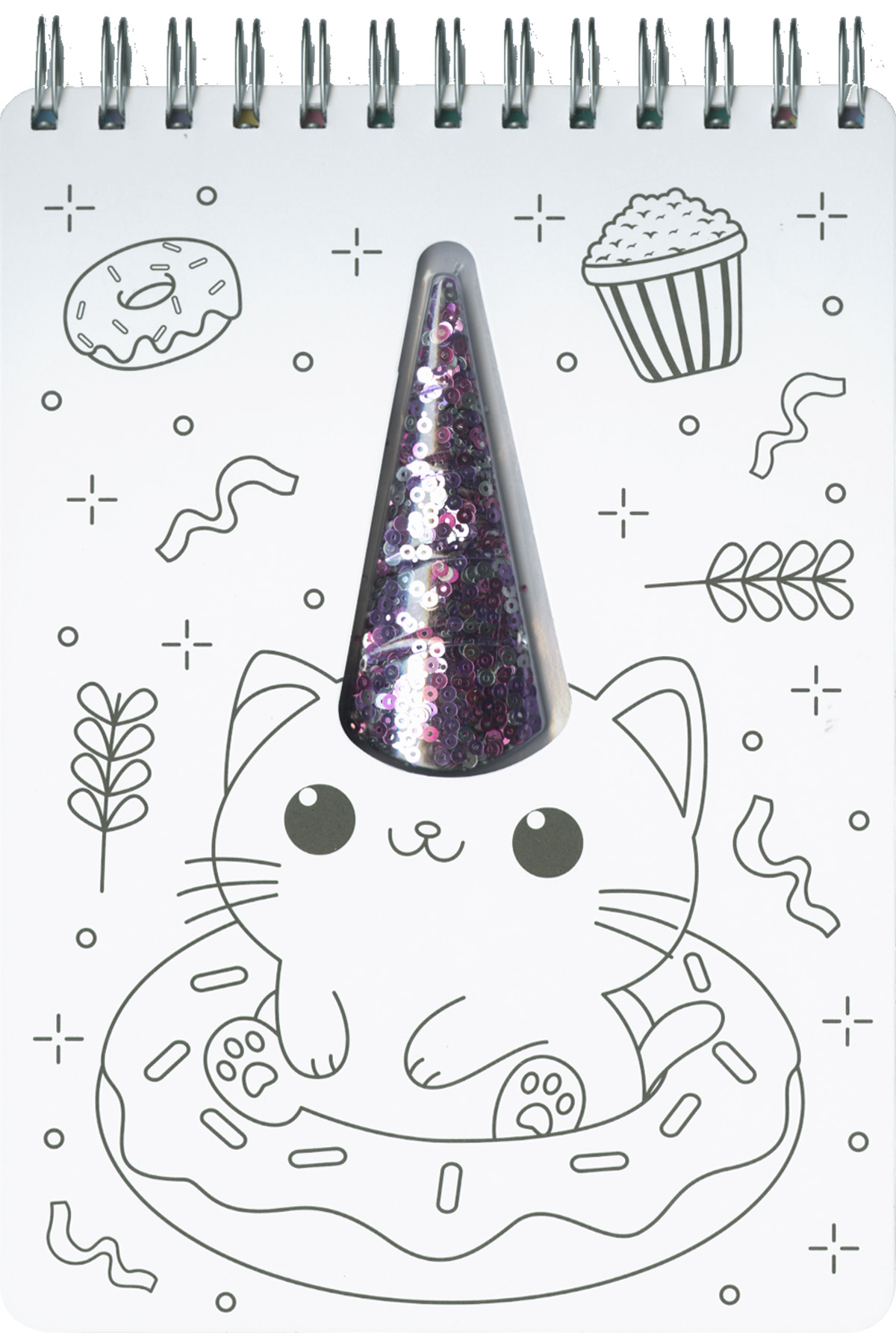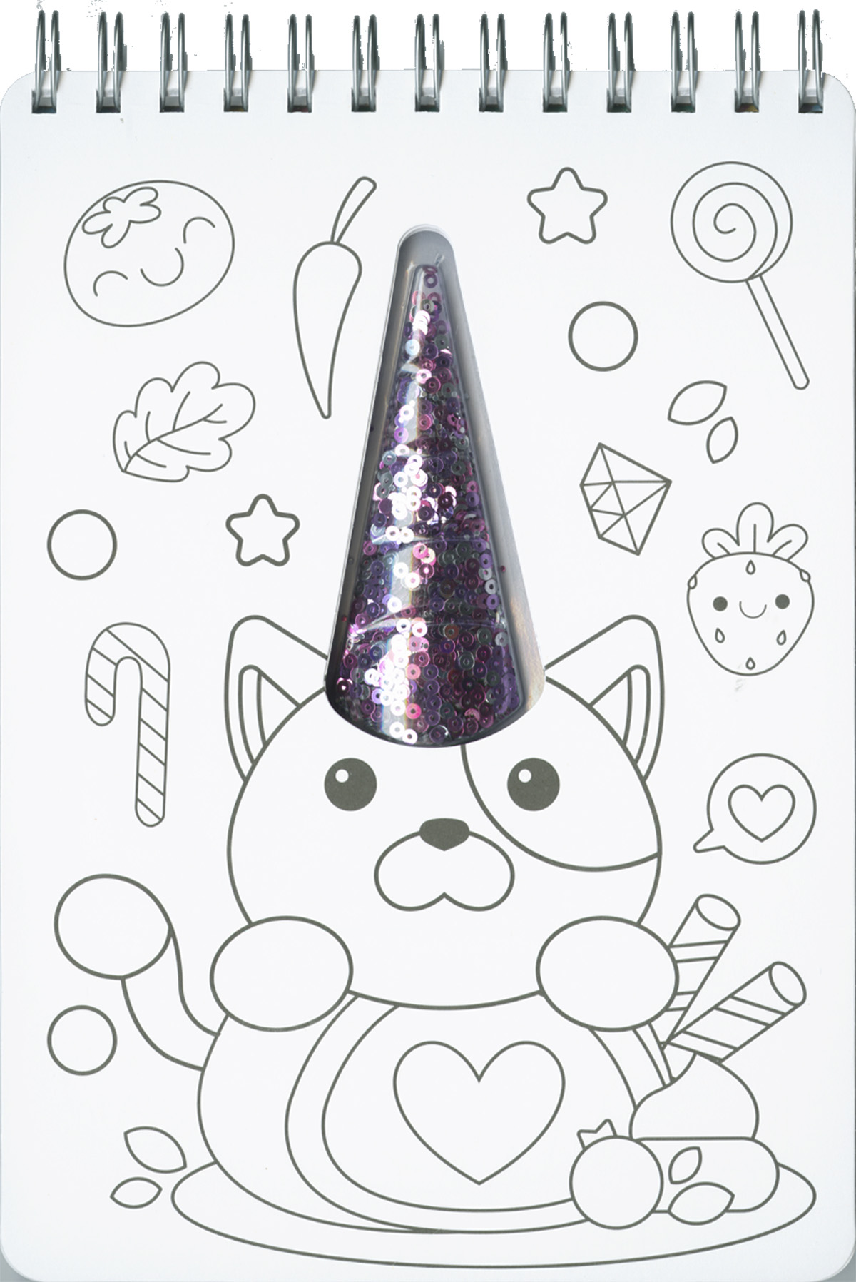 Encuadernación:  Wire-o y cartón con acabado en mate y troquelado. Con un blíster que contiene lentejuelas.
