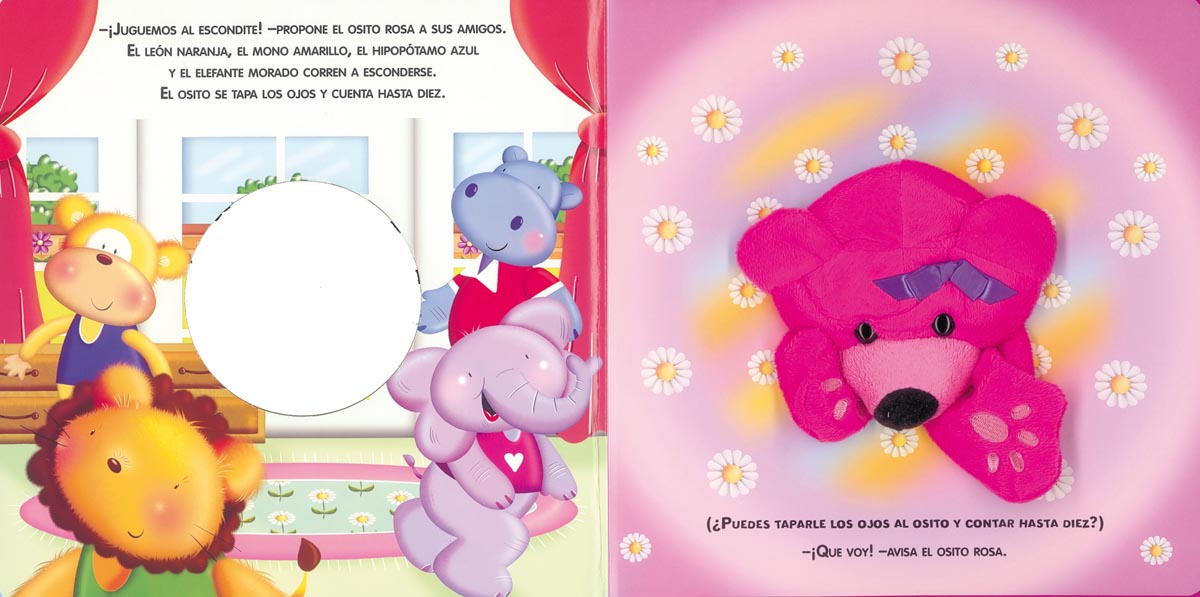 El osito rosa está jugando al escondite con sus amigos. ¿Le ayudas a encontrarlos? Prepárate para ir a dormir con esta suave y dulce marioneta.