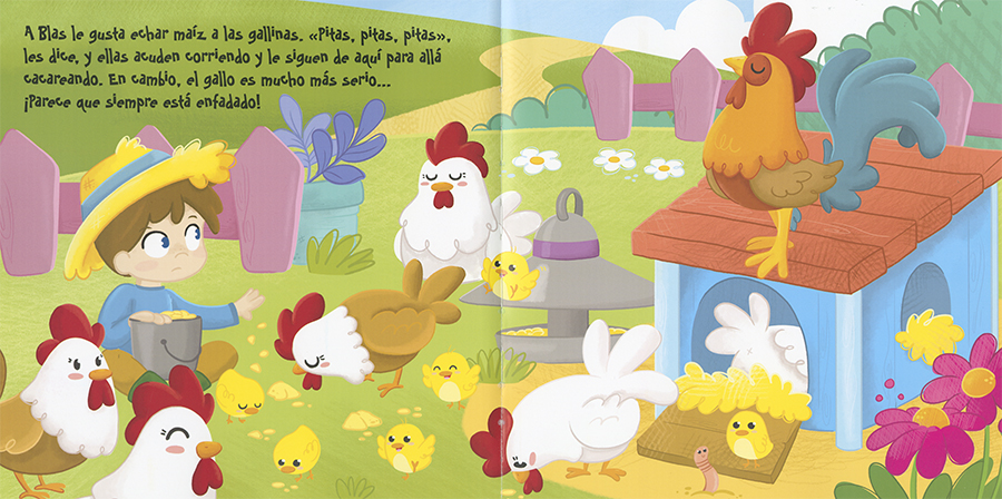 El abuelo de Blas tiene una granja con muchos animales. A Blas le gusta dar de comer a las gallinas, montar en el burrito y reírse con los cerdos y los conejos. Acompaña a Blas por la granja y descubre junto a él qué es lo que más le gusta a su abuelo.