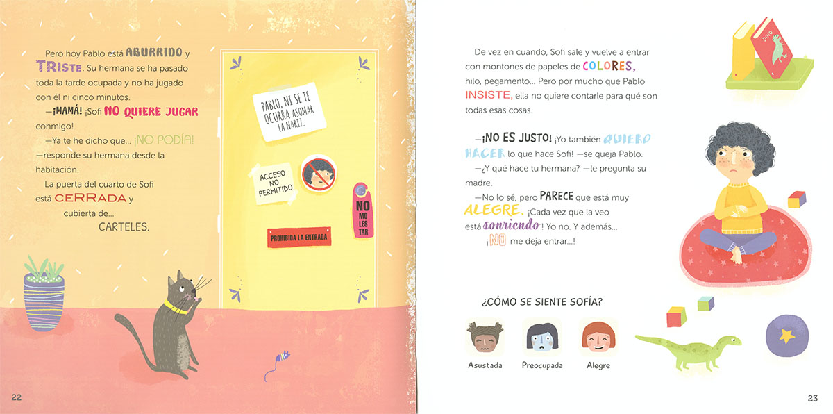 No hace falta explicar por qué la gestión de las emociones es importante para un niño que está en pleno crecimiento mental y emocional. Sin embargo, cuando nos acercamos a nuestros pequeños e intentamos, con nuestras palabras, poner nombre a ese vaivén de sentimientos sin identificar, lo hacemos con nuestra perspectiva y vocabulario de adulto. Y a veces el mensaje no les termina de llegar. Este libro, sin embargo, sitúa al adulto fuera, como mero espectador. Las escenas suceden dentro del mundo infantil, entre dos hermanos, Sofía y Pablo, y sus padres, que viven distintas situaciones en su vida diaria. Emociones como la tristeza, los celos, la alegría, el enfado, la frustración y el amor aparecen aquí de forma visual, atractiva y tierna.