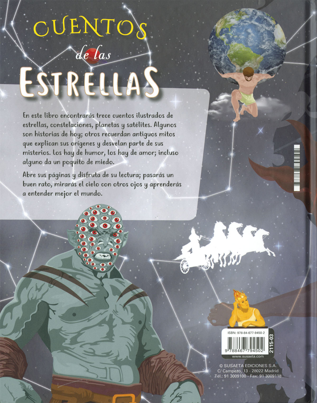 En este libro, encontrarás trece cuentos ilustrados de estrellas, constelaciones, planetas y satélites. Algunos son historias de hoy; otros recuerdan antiguos mitos que explican sus orígenes y desvelan parte de sus misterios. Los hay de humor, los hay de amor; incluso alguno da un poquito de miedo. Abre sus páginas y disfruta de su lectura; pasarás un buen rato, mirarás el cielo con otros ojos y aprenderás a entender mejor el mundo.