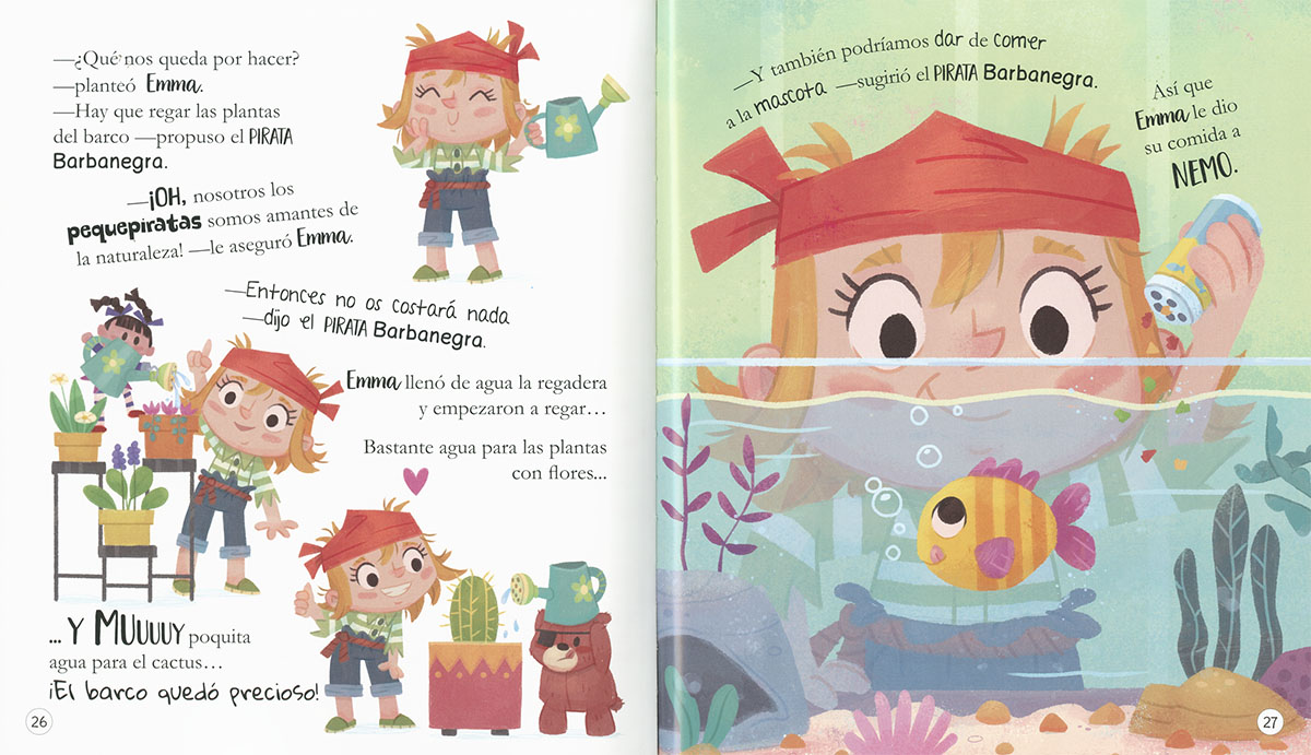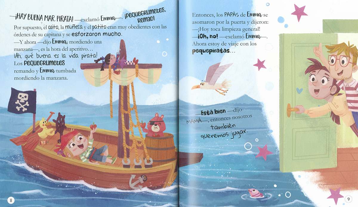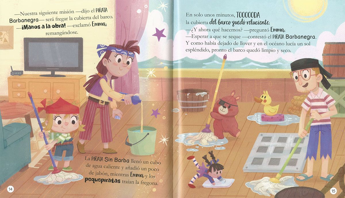 Un sábado lluvioso no era el mejor día para salir a jugar al parque, ni para montar en bici o patinar, pero sí para convertirse de nuevo... ¡en la pirata Emma! Así que la capitana reunió a su tripulación de pequepiratas y se dispuso a cargar el barco para una larga travesía. Pero entonces, aparecieron los padres de Emma, que también querían jugar a ser piratas. Se pusieron un nombre y... ¡a la aventura! Primero, había que preparar el camarote, luego fregar la cubierta, pescar la comida... ¡y mucho más! ¡Qué gran día pasaron todos juntos en casa jugando y trabajando! Una mañana de martes, Emma se despertó con muchas ganas de hacerse pirata, pero antes sus padres y sus abuelos le enseñaron todo lo que tiene que tener un pirata para ser el mejor: un buen desayuno, un uniforme perfecto, la bandera y la espada, ¡y mucho mucho más! Un gran libro ilustrado a todo color para los piratas más aventureros.