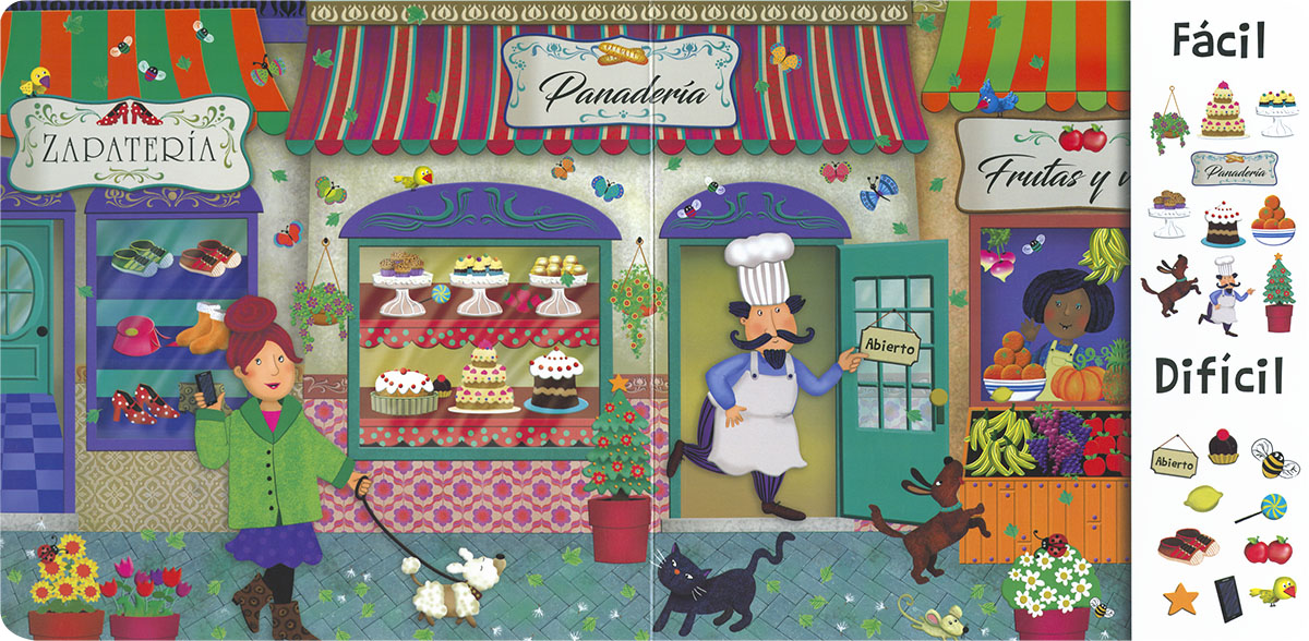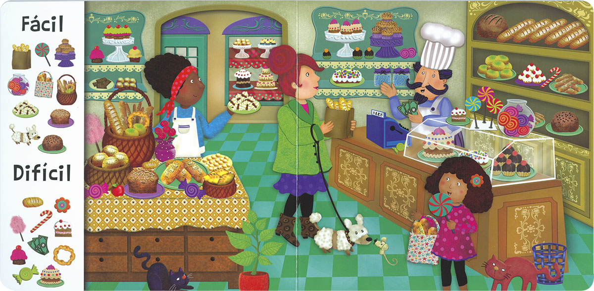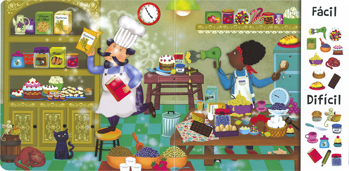 Tienes hambre? ¿Te apetece un poco de pan, o un rico pastel, una tarta o un bizcocho? Busca en las simpáticas escenas de este libro los objetos y personajes que te indican en cada página, unos más fáciles y otros menos fáciles, y diviértete durante horas.