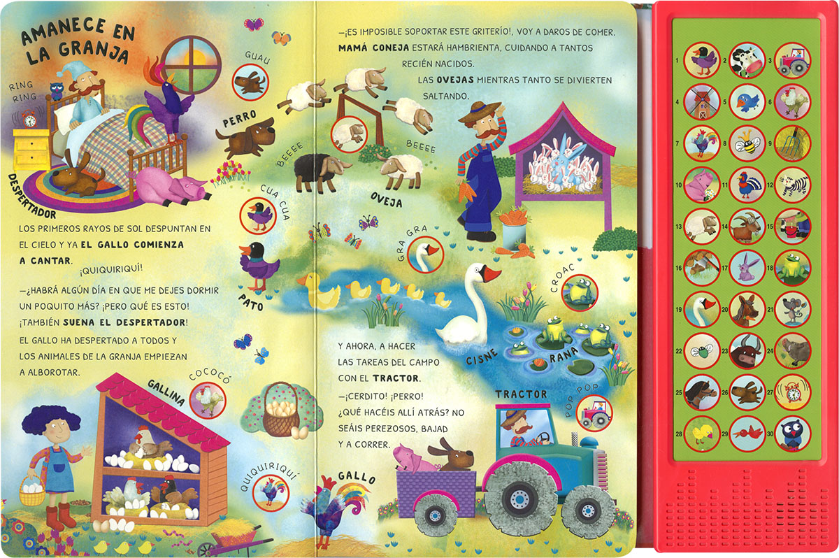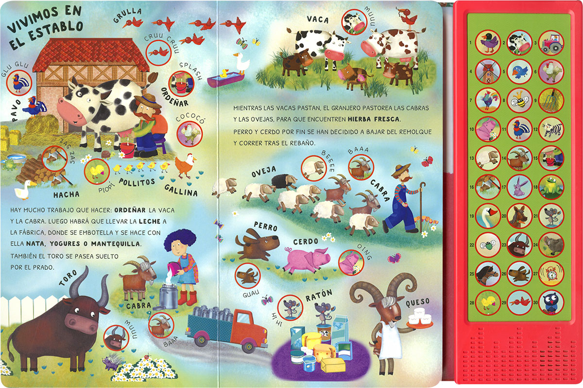 Bienvenido a la granja más ruidosa y divertida! Pulsa los botones sonoros para darle vida y descubrir las actividades de la granja y los sonidos de sus animales.