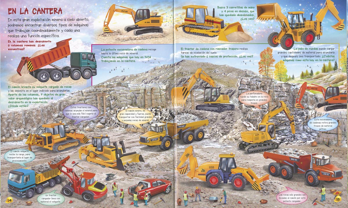 Un título más en esta colección para aprender y disfrutar buscando los numerosos animales, personas y objetos de todo tipo que se esconden en sus sorprendentes ilustraciones. En esta ocasión, se trata de conocer mejor el apasionante mundo de las grandes máquinas: en el campo, en las obras, en la minería, para transportar maquinaria pesada... ¡y mucho más!
