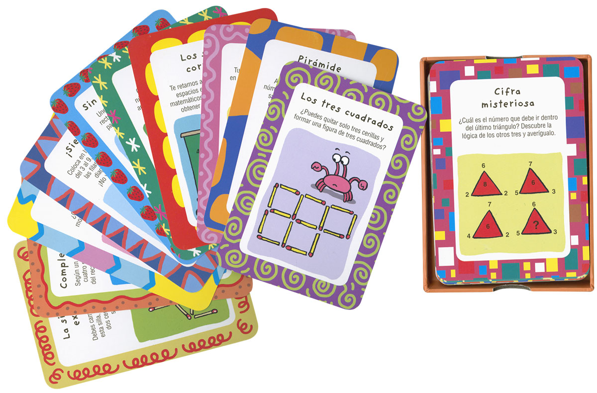 Una baraja superdivertida con 52 cartas diferentes, que incluyen desafíos matemáticos, enigmas lógicos, pirámides incompletas de números, sudokus, y mucho más. Para que te diviertas con tu familia y amigos a cualquier hora y en cualquier sitio, y disfrutes de las matemáticas.
