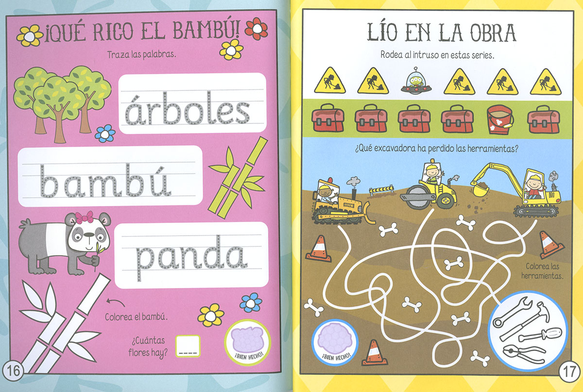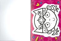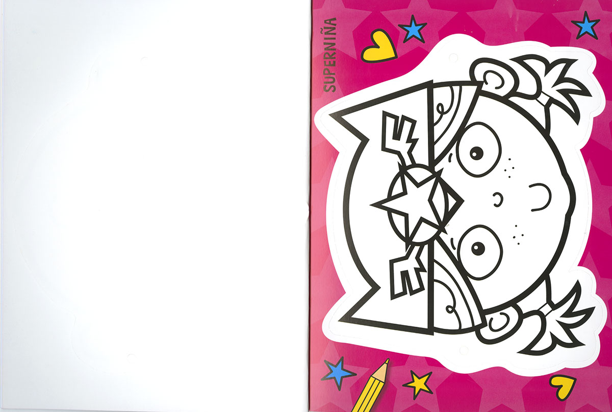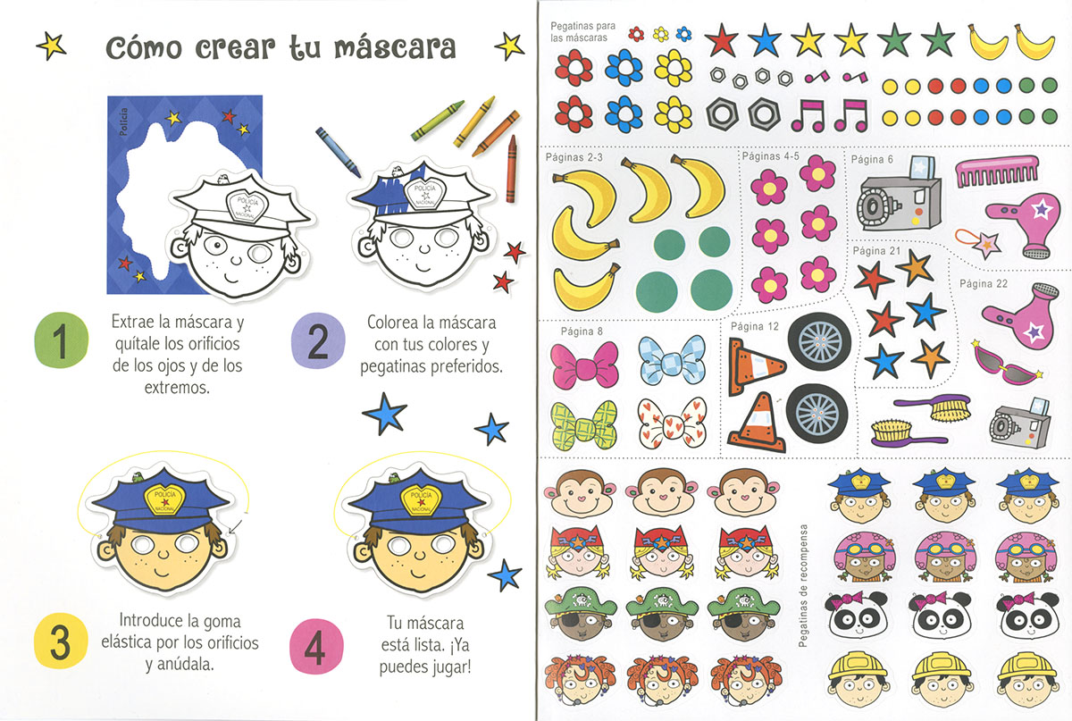 Encuadernación:  Cartulina plastificada brillo con estampación, 8 máscaras precortadas, goma elástica y pegatinas