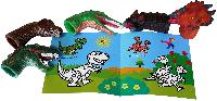 Encuadernación:  Blister de plástico que contiene un libro de cartulina plastificada brillo y 5 marionetas de dedo