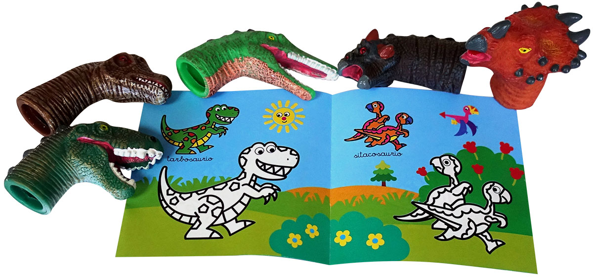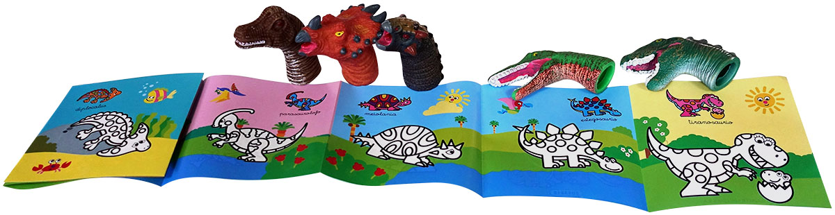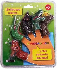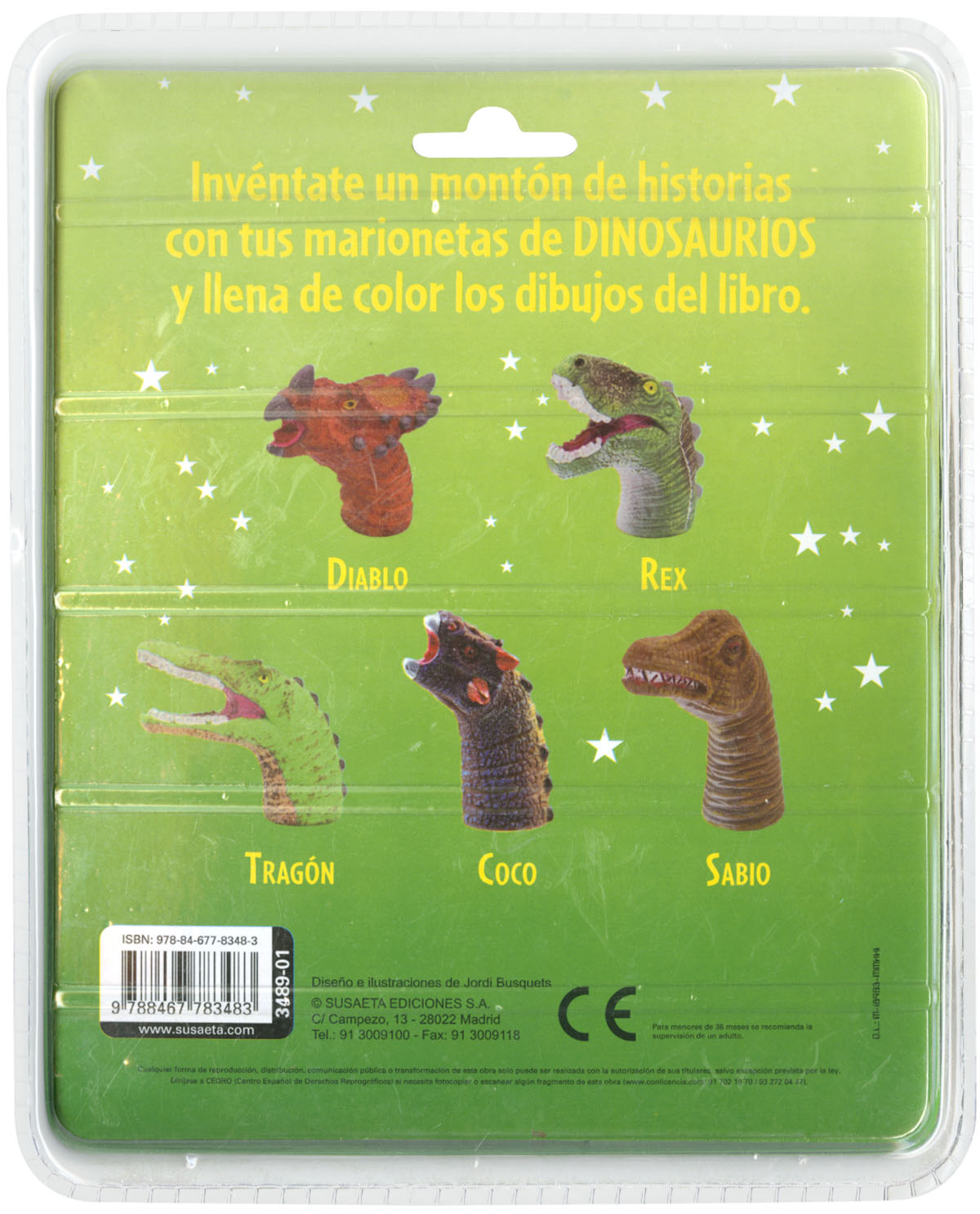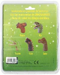 Invéntate un montón de historias con tus marionetas de dinosaurios y llena de color los dibujos del libro.