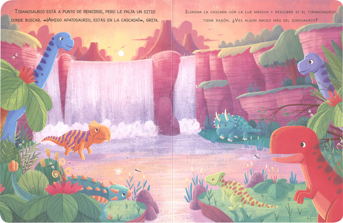 Descubre en este libro de cartón todo lo que se oculta entre los dinosaurios iluminando sus ilustraciones con la linterna. Lee ¡y sorpréndete!