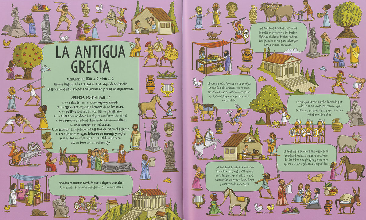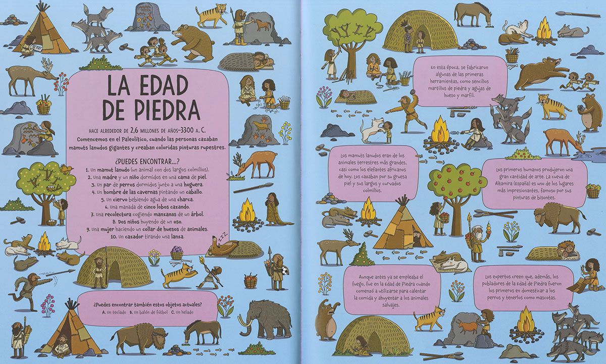 Viaja en el tiempo con este magnífico libro de buscar. Desde la edad de piedra hasta la era espacial, pasando por la antigua Roma, navegando con los vikingos o merendando en la edad media. Hay más de 150 objetos que encontrar y muchos datos históricos apasionantes.