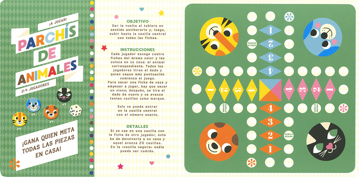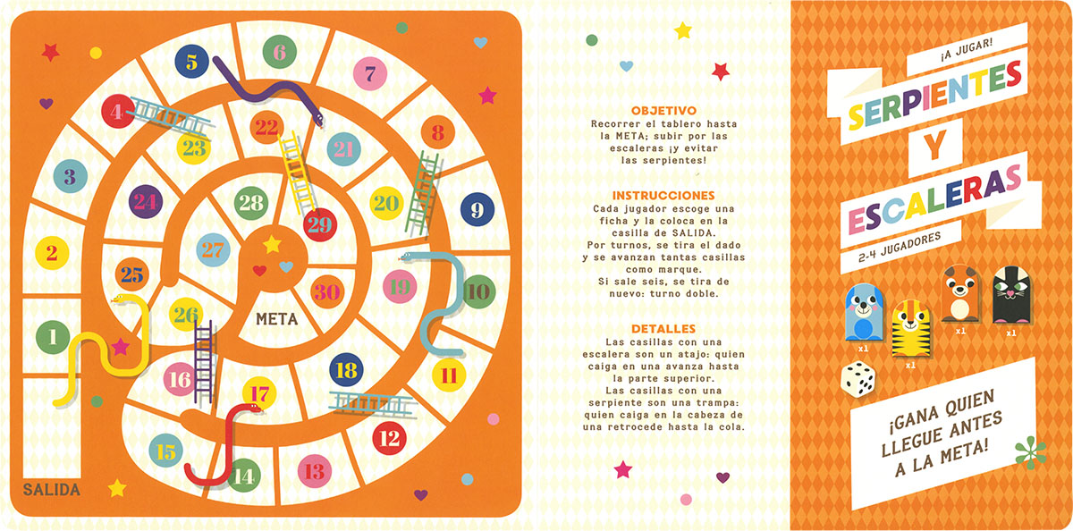 Cuatro juegos de mesa clásicos en este libro de cartón que contiene tableros, fichas e instrucciones: Serpientes y escaleras, Parchís de animales, Las cuatro en raya y el Juego del molino. Juegos de dos a cuatro jugadores en un práctico formato de libro. ¡Diversión para todos!
