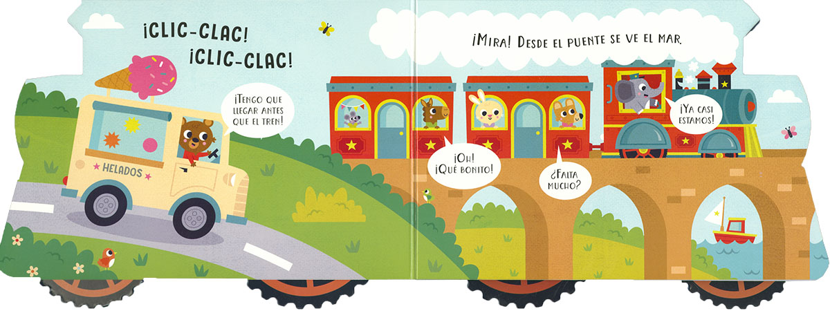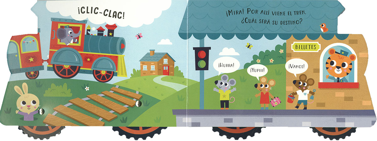 Viaja de la ciudad a la playa mientras te diviertes con el traqueteo de las ruedas del tren: este libro de cartón con forma de locomotora ¡tiene ruedas que suenan al girar! Un libro-juguete que encantará a los peques de la casa.