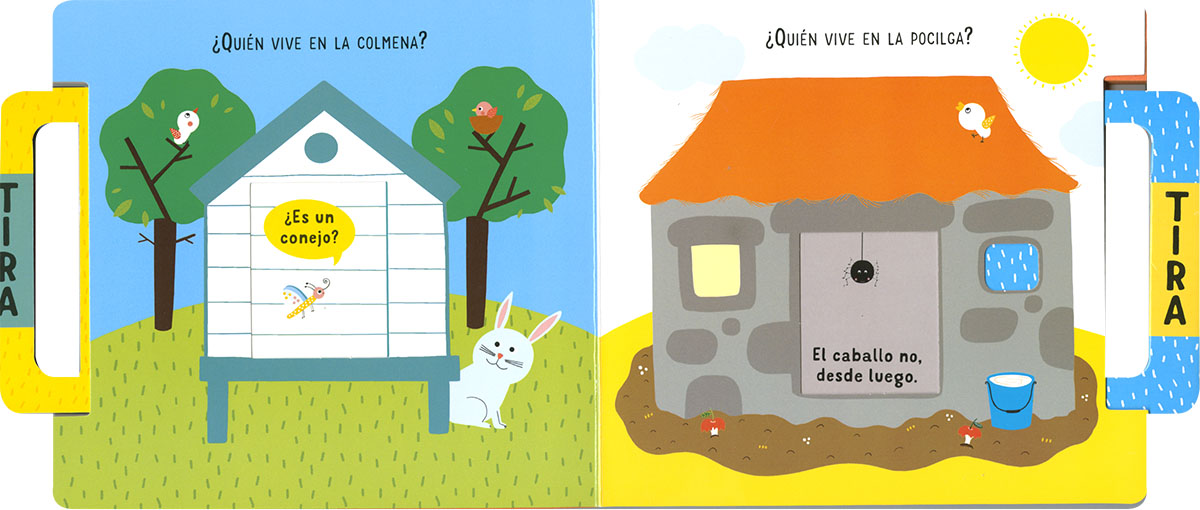 Quién vive en el establo? ¿Y en la pocilga? ¿Quieres averiguarlo? Tira del asa para saber dónde tienen su casa los animales; te encantará hacerlo una y otra vez ¡porque suena con el movimiento! Un libro de cartón ideal para los pequeños de la casa.
