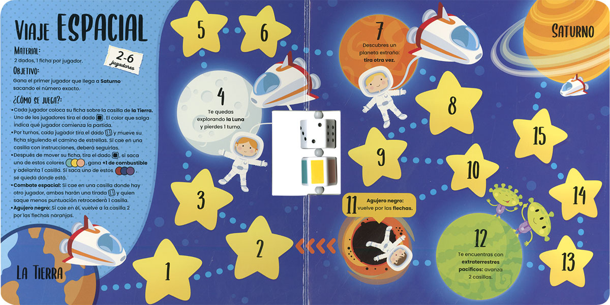 Encuadernación:  Cartoné con cubierta plastificada brillo, troquelado con dados y fichas dentro.