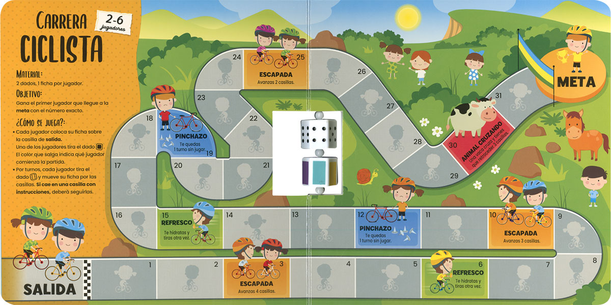 Un fantástico libro troquelado para jugar en casa, en el coche o de vacaciones, estés donde estés. Con todo lo necesario para pasártelo en grande en familia o con los amigos: cuatro tableros con juegos diferentes relacionados con los deportes, dos dados (uno de colores y otro de números) y seis fichas adhesivas reutilizables. ¡Llévatelo contigo a donde quieras!