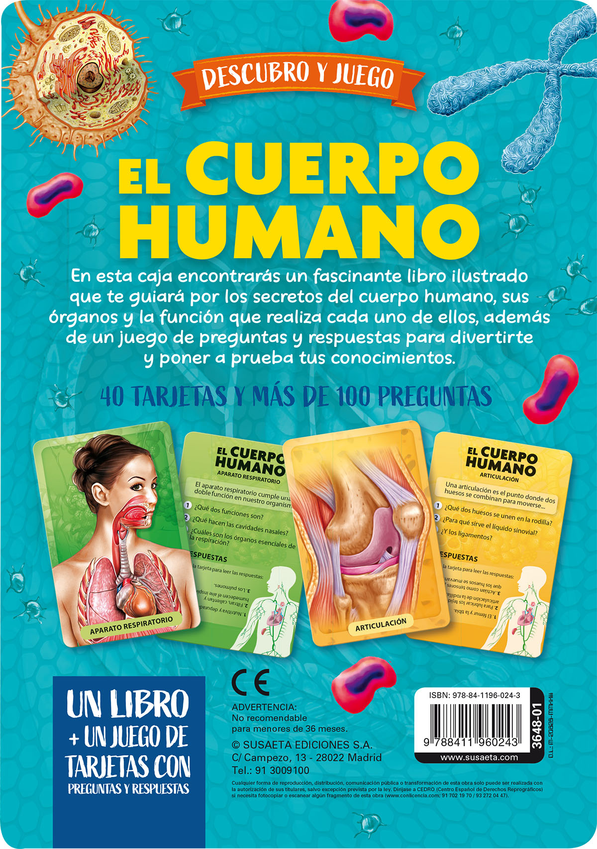 En esta caja encontrarás un fascinante libro ilustrado que te guiará por los secretos del cuerpo humano, sus órganos y la función que realiza cada uno de ellos, además de un juego de preguntas y respuestas con 40 tarjetas y más de 100 preguntas para divertirte y poner a prueba tus conocimientos. Aprovéchalo también para tus tareas escolares, ¡seguro que te viene genial!