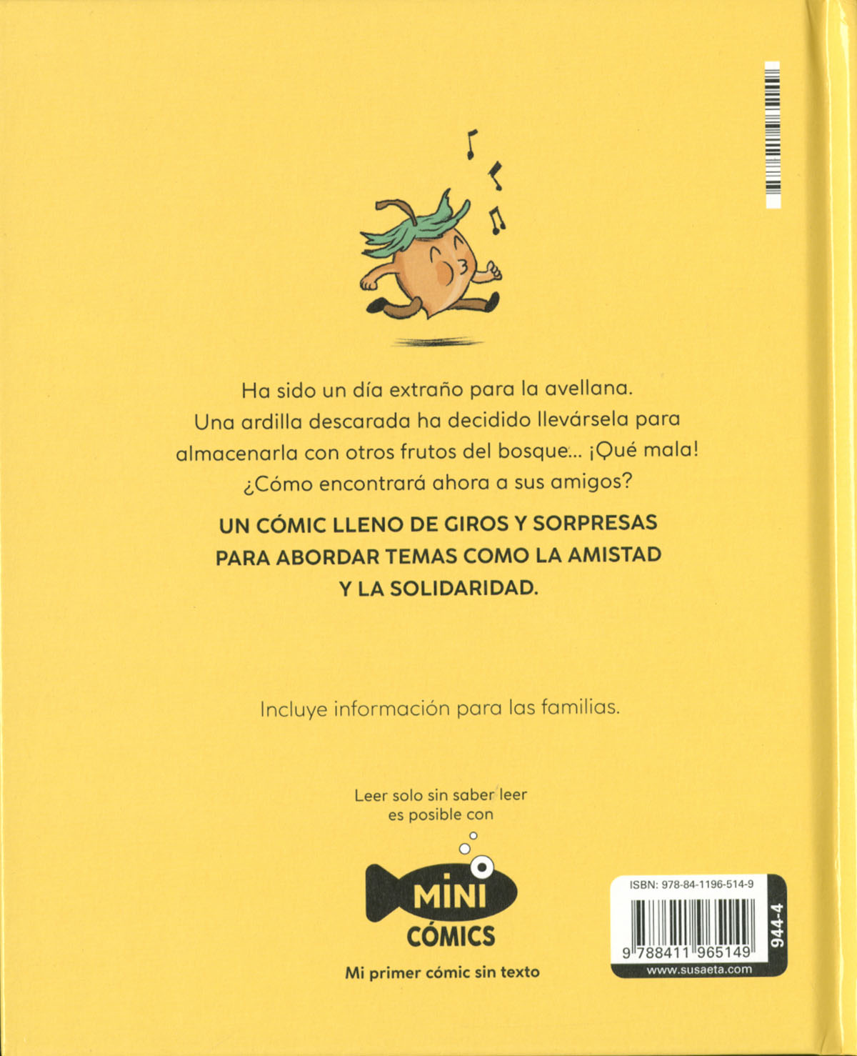 Leer solo sin saber leer es posible! Tu primer cómic sin texto está en la colección Mini Cómics. Ha sido un día extraño para la avellana. Una ardilla descarada ha decidido llevársela para almacenarla con otros frutos del bosque... ¡Qué mala! ¿Cómo encontrará ahora a sus amigos? Un cómic lleno de giros y sorpresas para abordar temas como la amistad y la solidaridad.