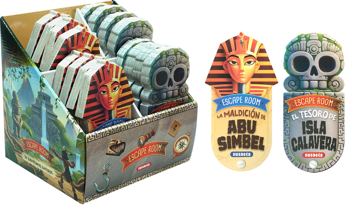 Estuche de la colección Escape Room con 16 ejemplares surtidos de los dos títulos de la colección.