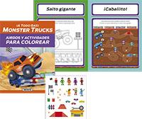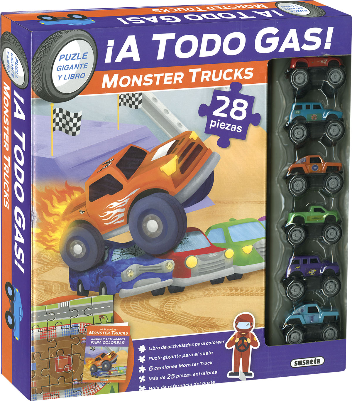 Un completo kit infantil que incluye un libro de actividades para colorear, un puzle gigante de 28 piezas, figuritas extraíbles y 6 camiones con cuerda hacia atrás con los que divertirse... ¡a todo gas!