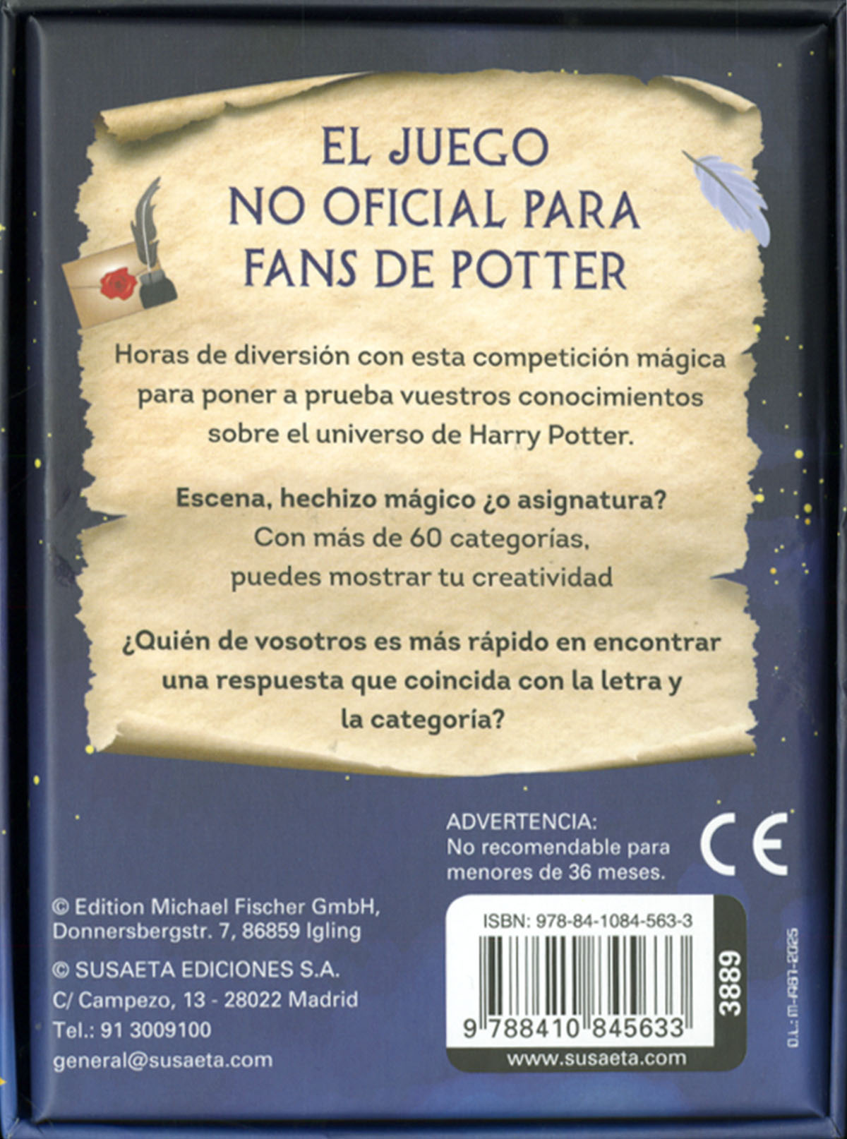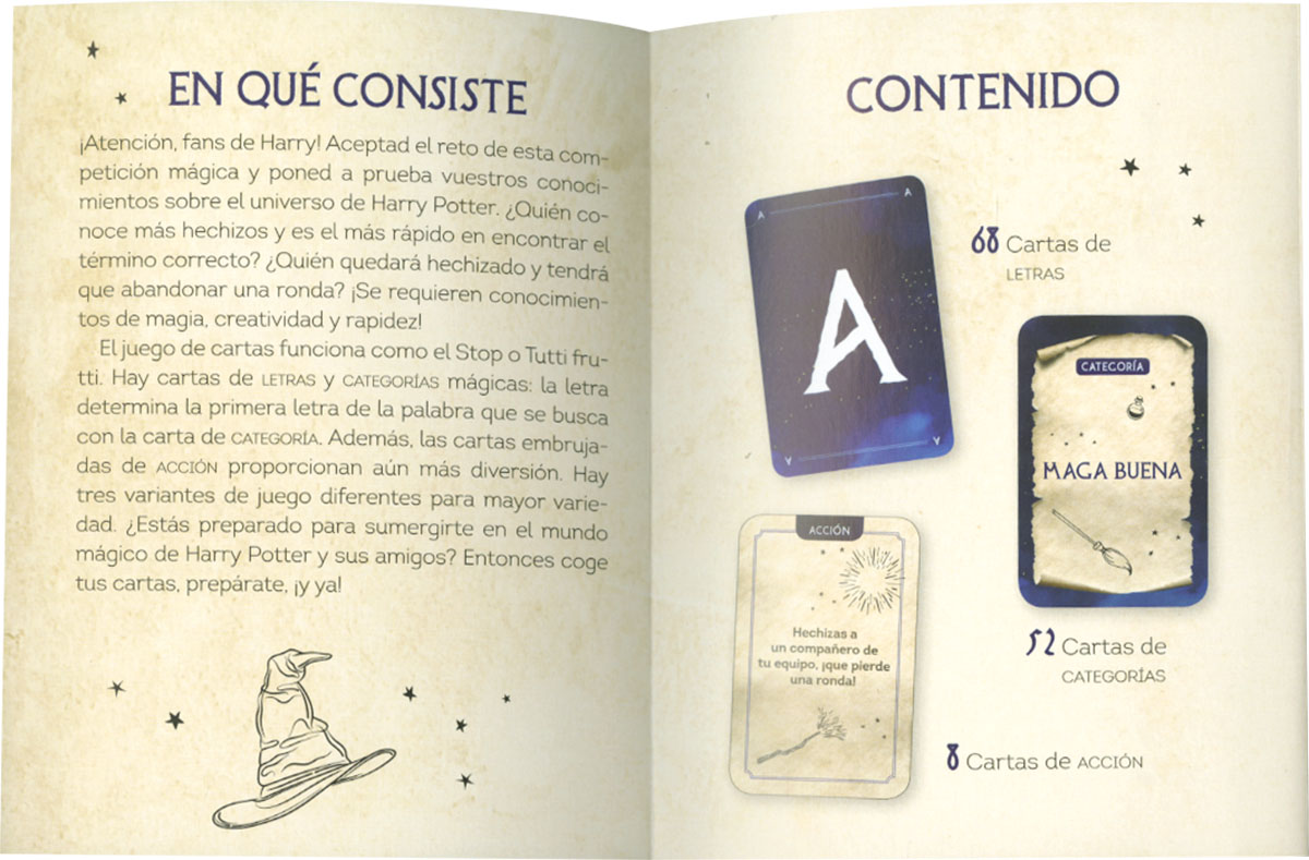 Atención, Potterheads, aceptad el reto de esta competición mágica y poned a prueba vuestros conocimientos sobre el universo de Harry Potter. ¿Quién conoce más hechizos y es el más rápido en encontrar el término correcto? ¿Quién quedará hechizado y tendrá que abandonar una ronda? ¡Se requieren conocimientos de magia, creatividad y rapidez! Este juego de cartas funciona como el Stop o Tutti frutti. Más de 60 categorías con las que vas a demostrar tu creatividad y agilidad mental.