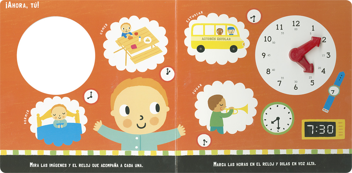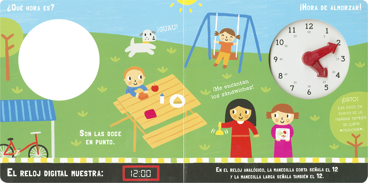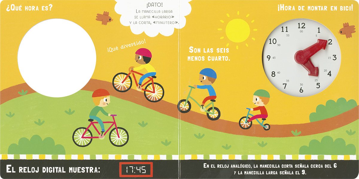 Aprende las horas con este libro y su reloj de manecillas. Las instrucciones sencillas, las ilustraciones y algunos trucos te ayudarán a leer la hora en un reloj analógico y en uno digital.