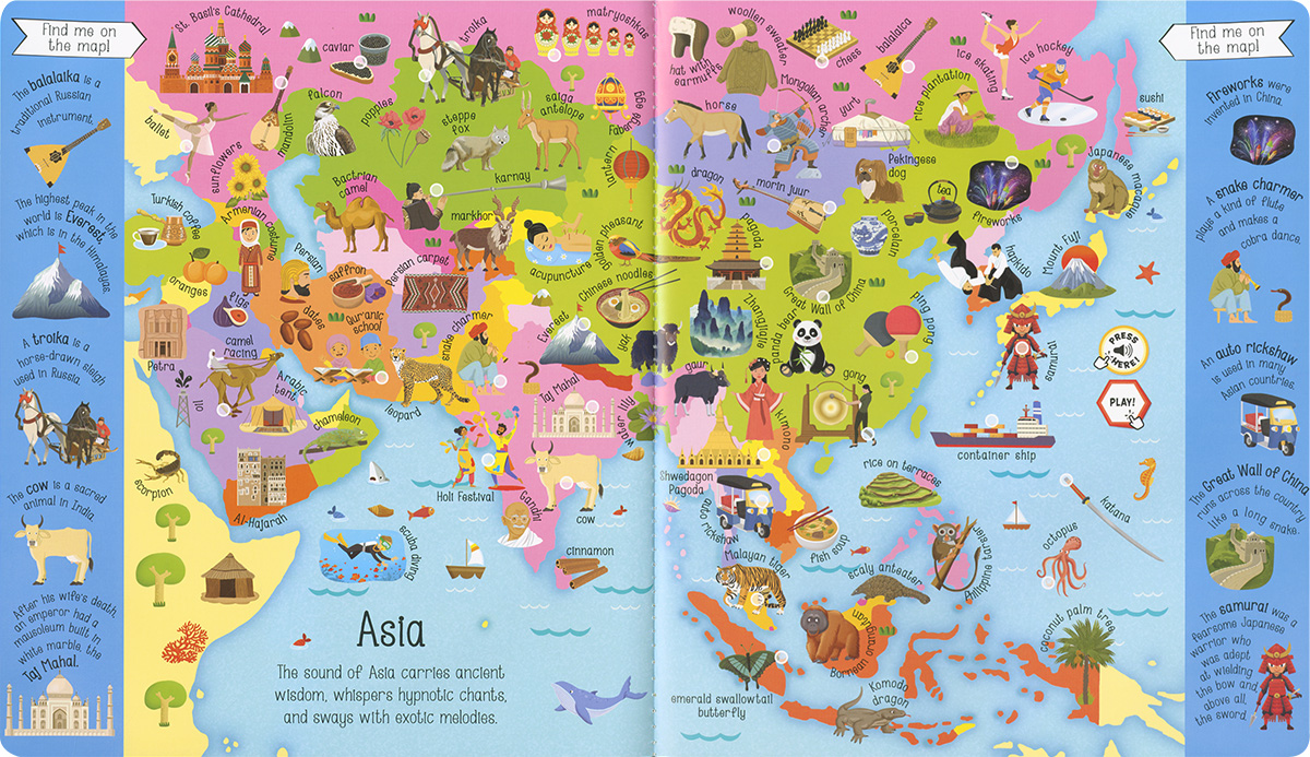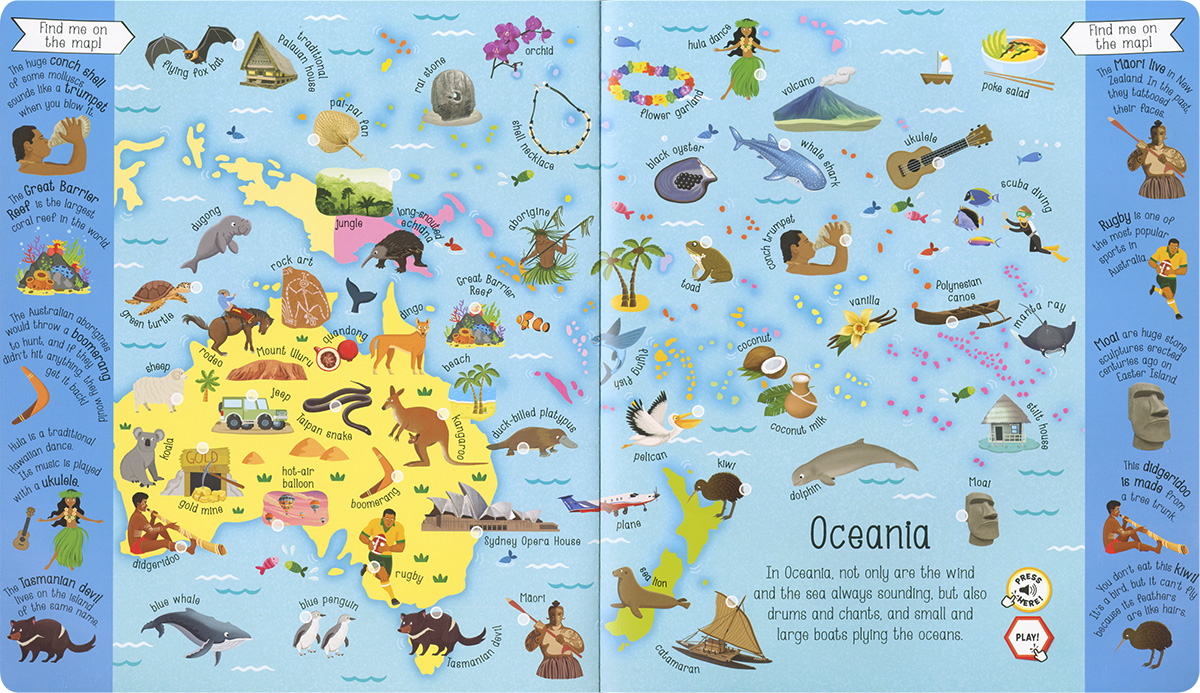 Ears wide open to read this book! With 200 sounds of music and instruments, animals, monuments, items, peoples and cultures, have fun guessing and matching them all! Look for and find the pictures on the maps. Listen carefully: what does it sound like? Play, learn and enjoy travelling around the world!