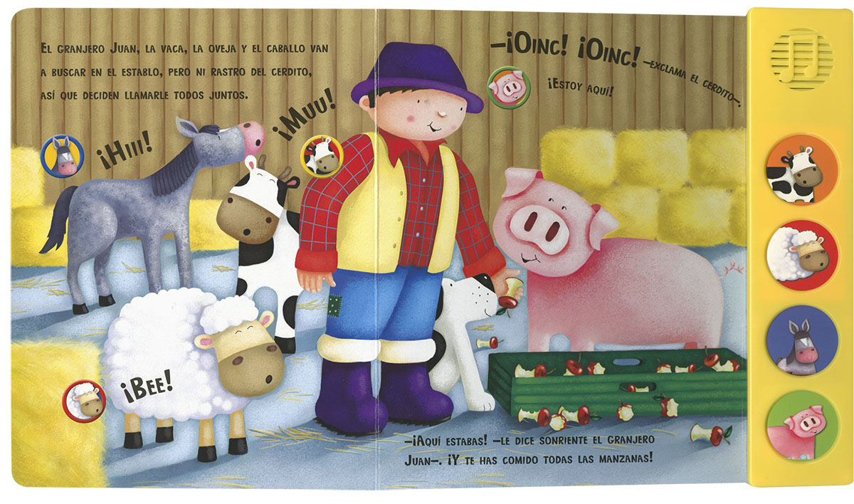 Pulsa los botones sonoros que encontrarás en este simpático libro y ayuda al granjero Juan y a los animales a encontrar al cerdito. ¡Aprenderás qué sonido hace cada uno de los animales de la forma más divertida!