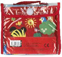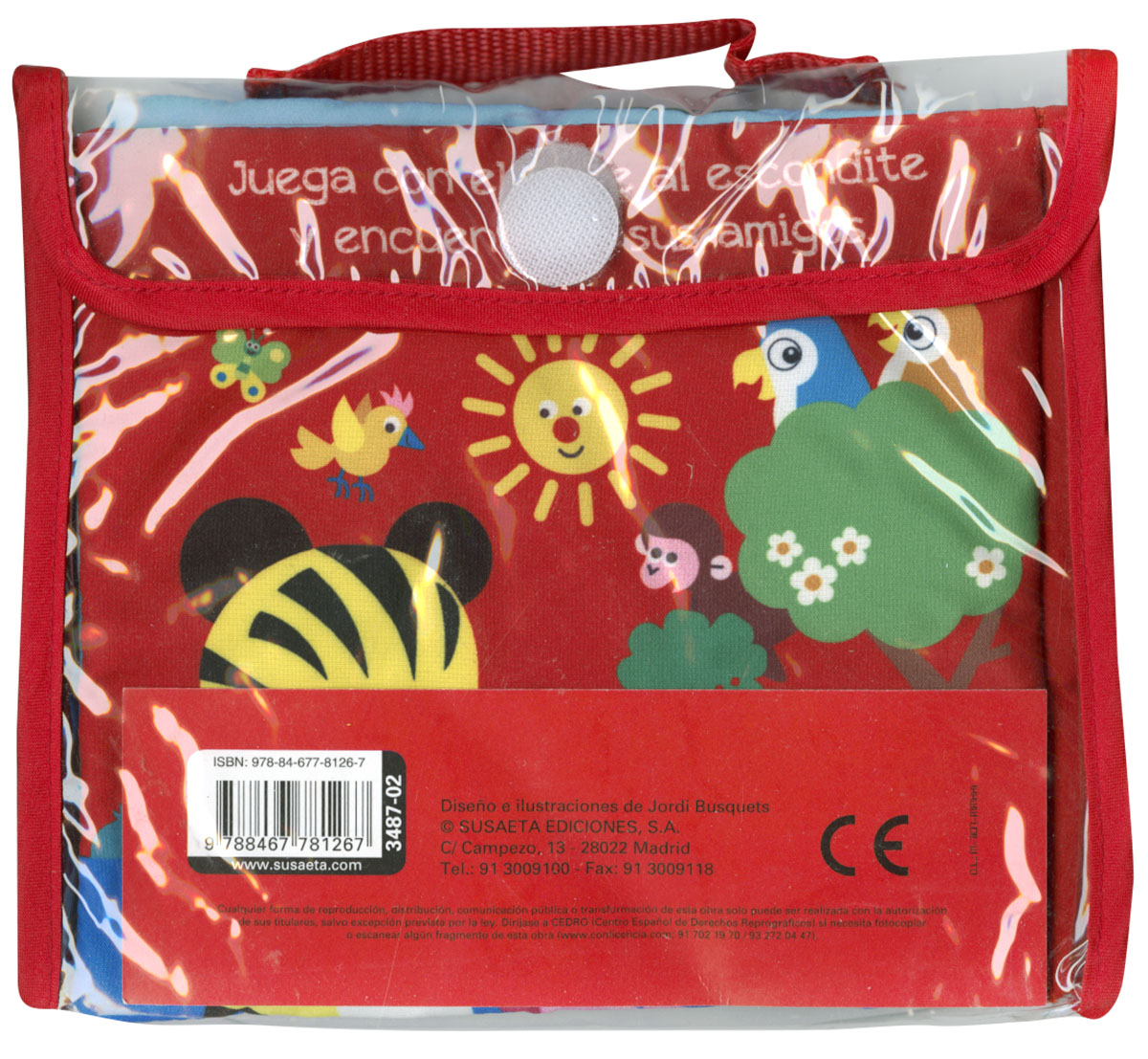 Encuadernación:  Bolsa de plástico con asa y cierre de velcro, cont.libro de tela acolchado con sonido en las páginas
