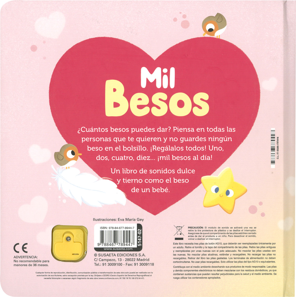 Cuántos besos puedes dar? Piensa en todas las personas que te quieren y no guardes ningún beso en el bolsillo. ¡Regálalos todos! Uno, dos, cuatro, diez... ¡mil besos al día! Un libro de sonidos dulce y tierno como el beso de un bebé.