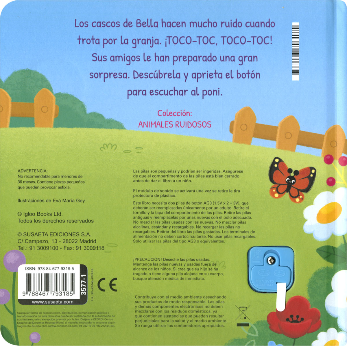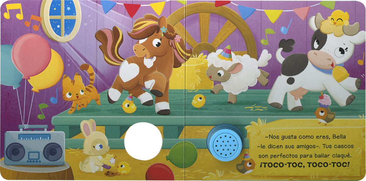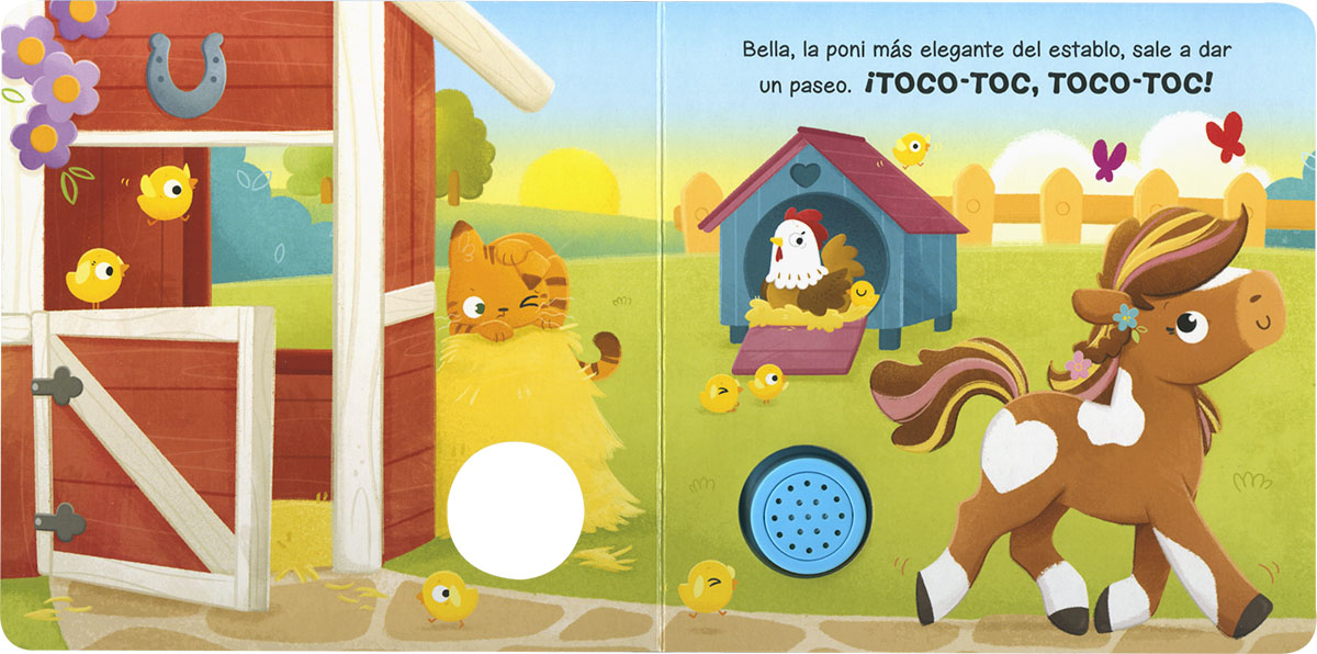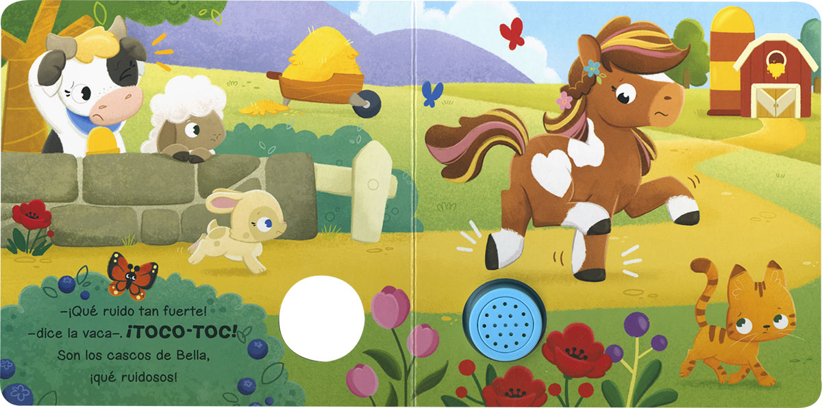 Los cascos de Bella hacen mucho ruido cuando trota por la granja. Sus amigos le han preparado una gran sorpresa. Desc煤brela con este libro de cart贸n y aprieta el bot贸n para escuchar al poni.
